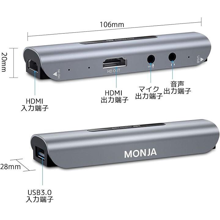 ・「サイズ/重さ/端子」106x28x20mm/45g/ HDMI入出力端子(入力x1、出力x1)、USB 2.0端子x1、ヘッドセット入出力端子x1、3.5mmマイク出力端子x1