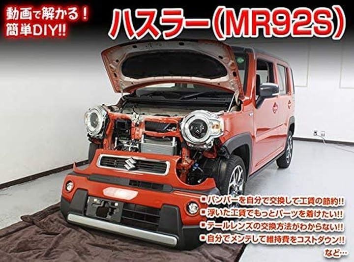 ・ルームランプ交換方法、ライト交換方法・ フロント(リア)バンパー交換方法・内張り交換方法などなど、HUSTLER(MR 92 S) の 各種パーツの取外し方法や取付け方法、改造やチューニングを解説したDVD。