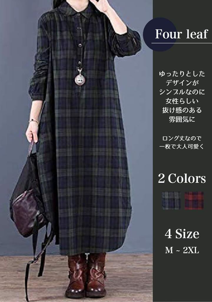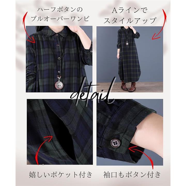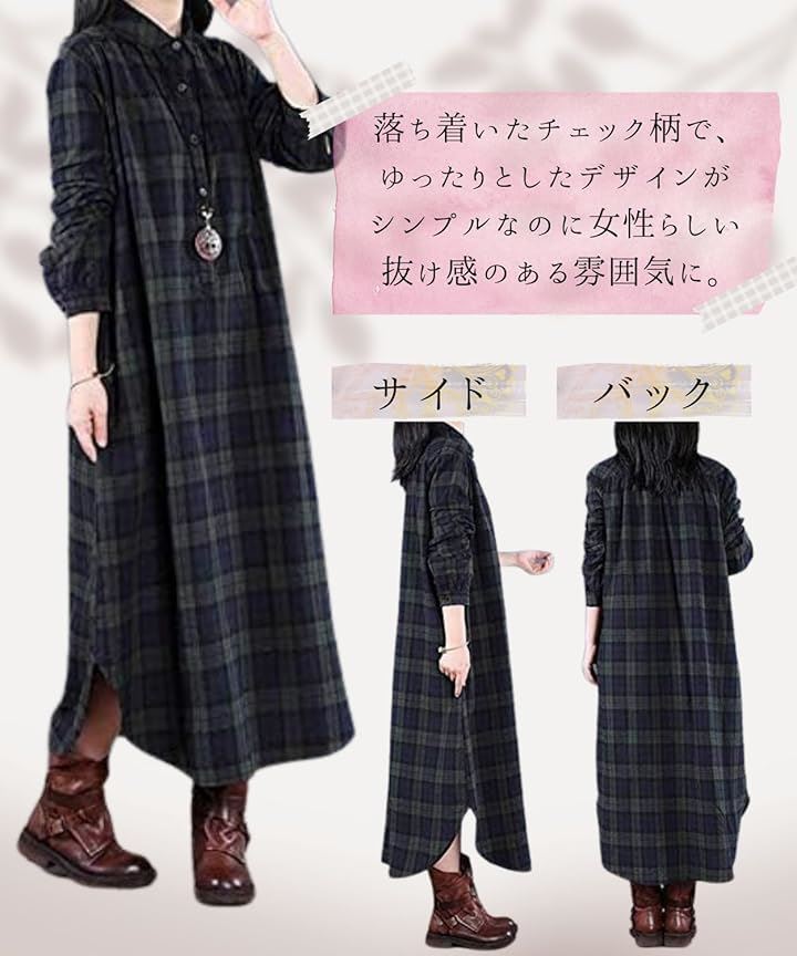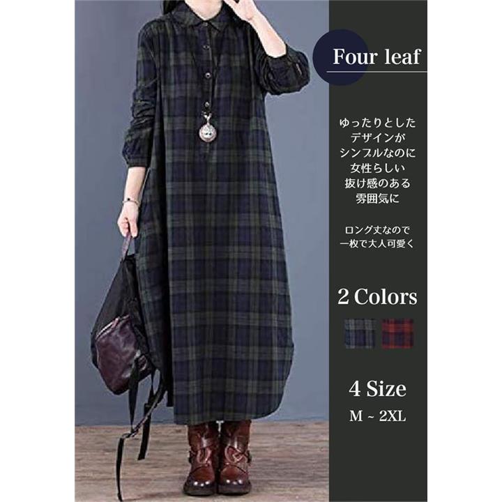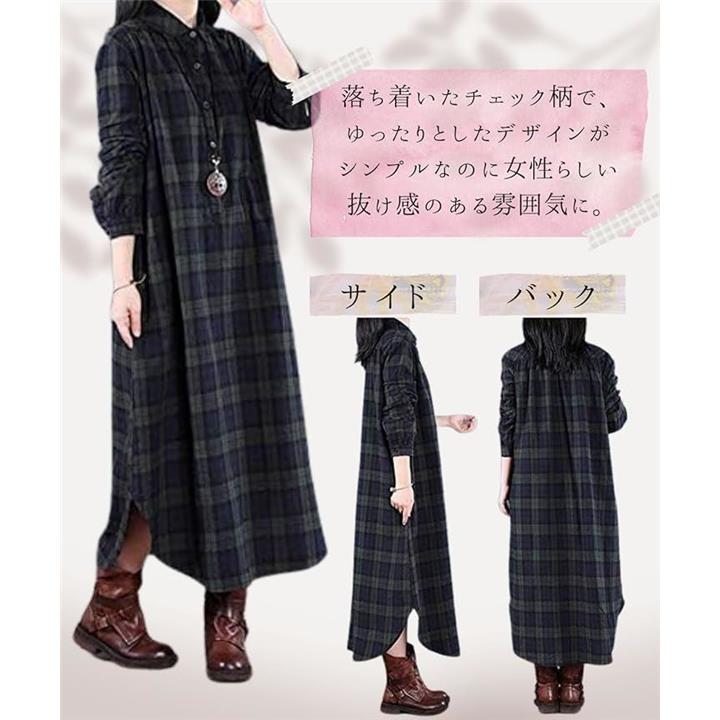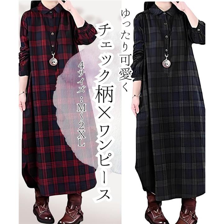 ワンピース レディース 可愛い 春 秋冬 きれいめ 長袖襟付き ロング丈 体型カバー チェック柄