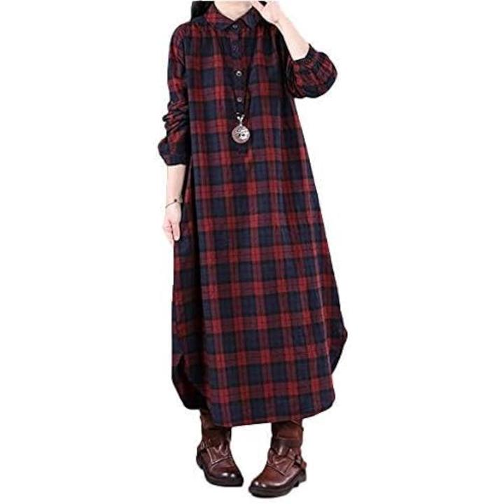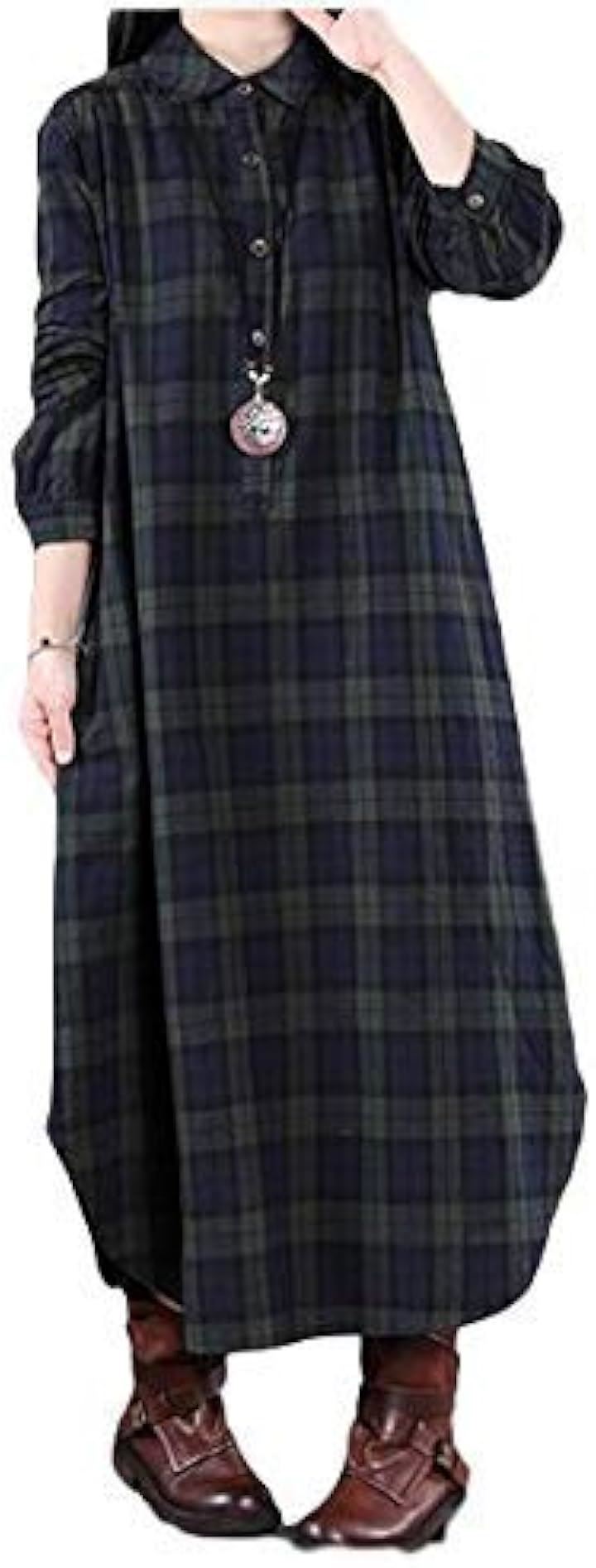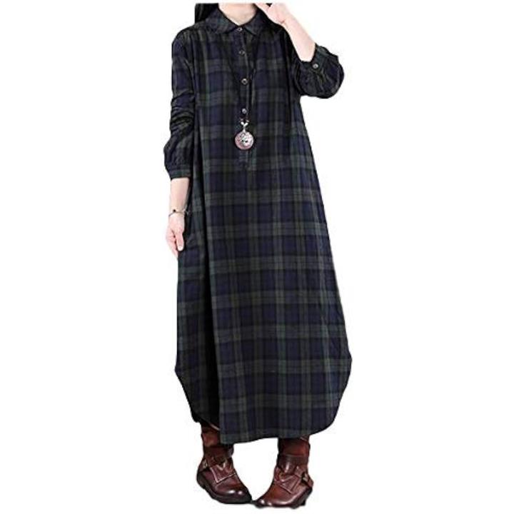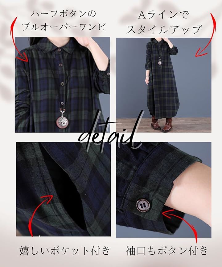 ワンピース レディース 可愛い 春 秋冬 きれいめ 長袖襟付き ロング丈 体型カバー チェック柄