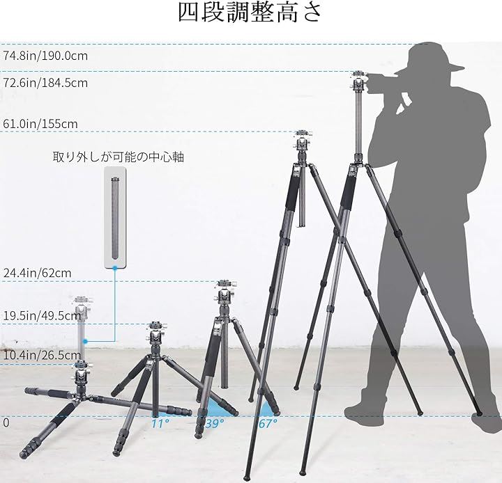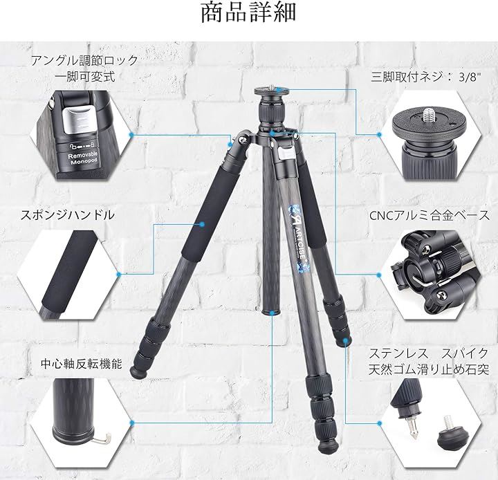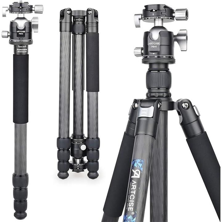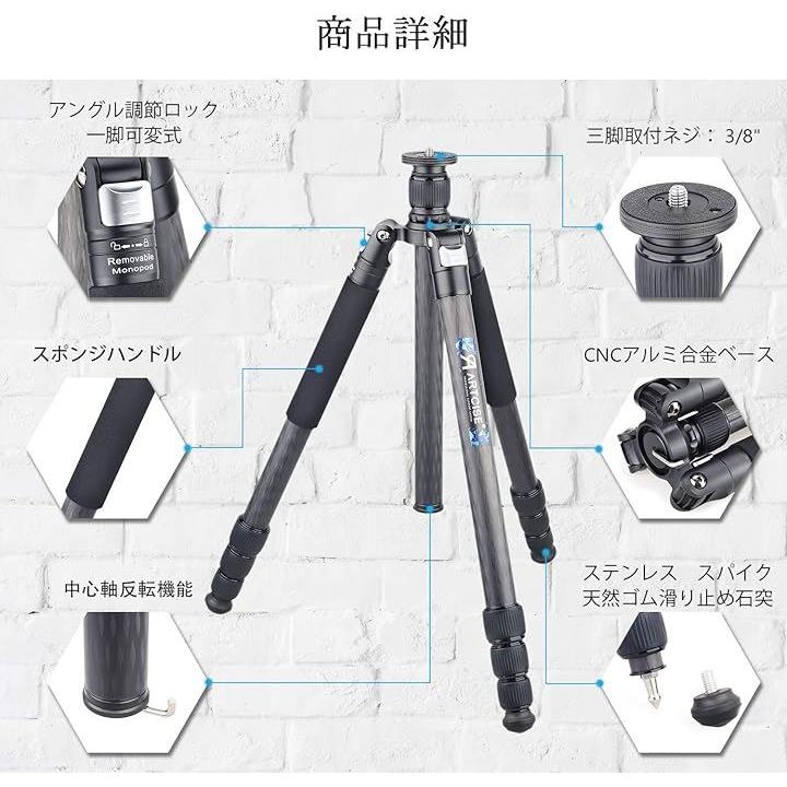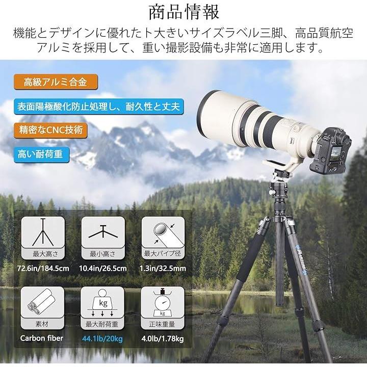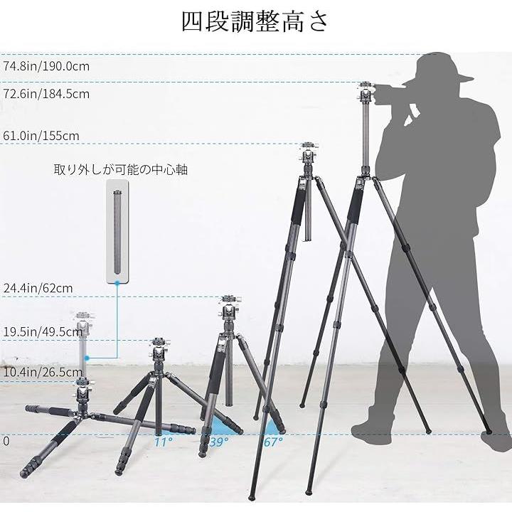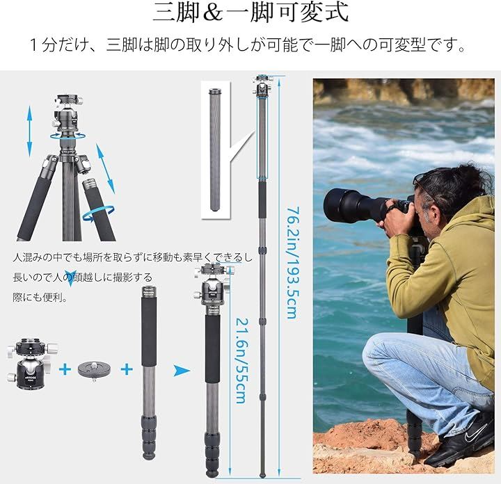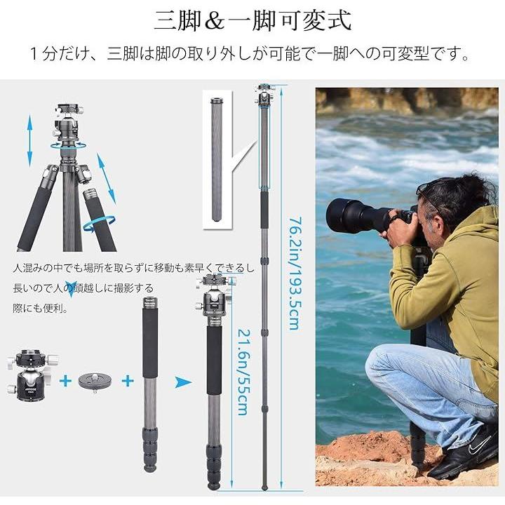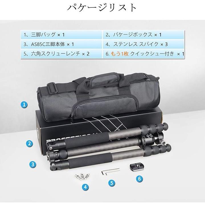 カメラ カーボン 三脚 ナットロック式 四段 トラベル 一脚伸縮可変式 全伸高 184.5cm パノラマ 40 mmボール低重心雲台 クイックシュー 三脚バッグ 付き DSLR ミラーレス スマートフォン等対応 最大耐荷重 20キロ AS85C