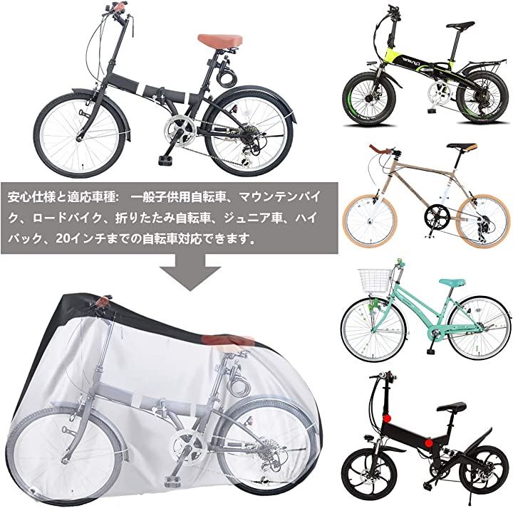 「20インチまで」対応「サイズ」カバー寸法:約170cmx85cmx60cm適応車種:一般子供用自転車、マウンテンバイク、ロードバイク、折りたたみ自転車、ジュニア車、ハイバック、16~20インチまでの自転車対応できます。