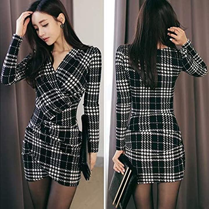 [ISLAYCAOLILA] キャバドレス ミニドレス クラブドレス パーティードレス ワンピース タイト ミニ カシュクール チェック プリント Vネック 長袖 ハイウエスト ギャザー レディース |