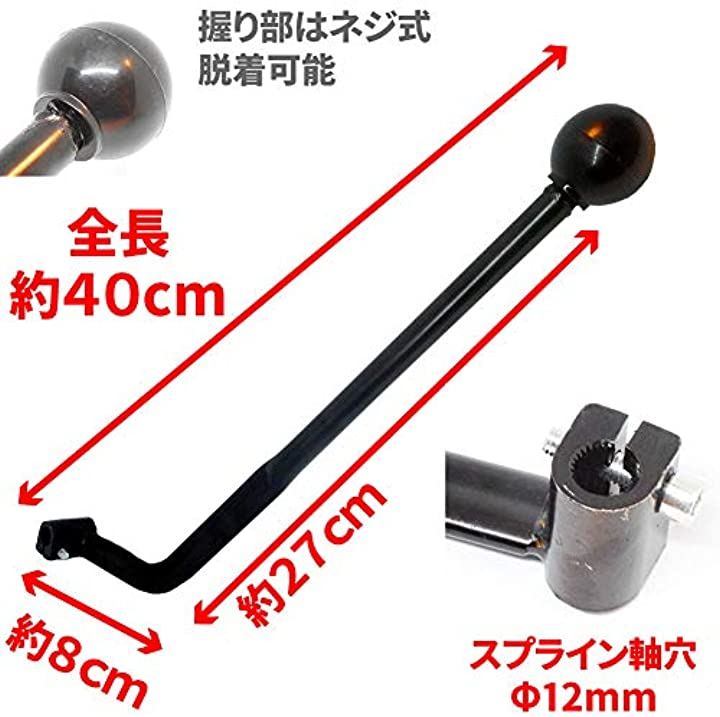 「サイズ」全長:約400mm 接続部スプライン径:約12mm 「材質」本体:スチール グリップ部:樹脂 車種によって、ジョッキーレバーについている固定ボルトがエンジン、 ミッション等と干渉する場合がありますので、その際は短めのボルトに交換する 等加工が必要になる場合があります。