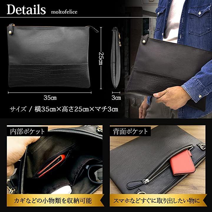 クラッチバッグの内容紹介「表面素材はこだわりの上質なPUレザー」一見本革と見分けのつかない光沢感と皺感を持つ上質な肉厚PUレザーを使用。