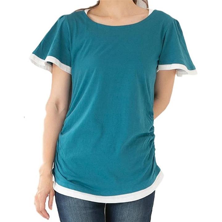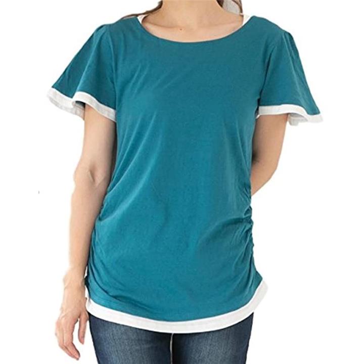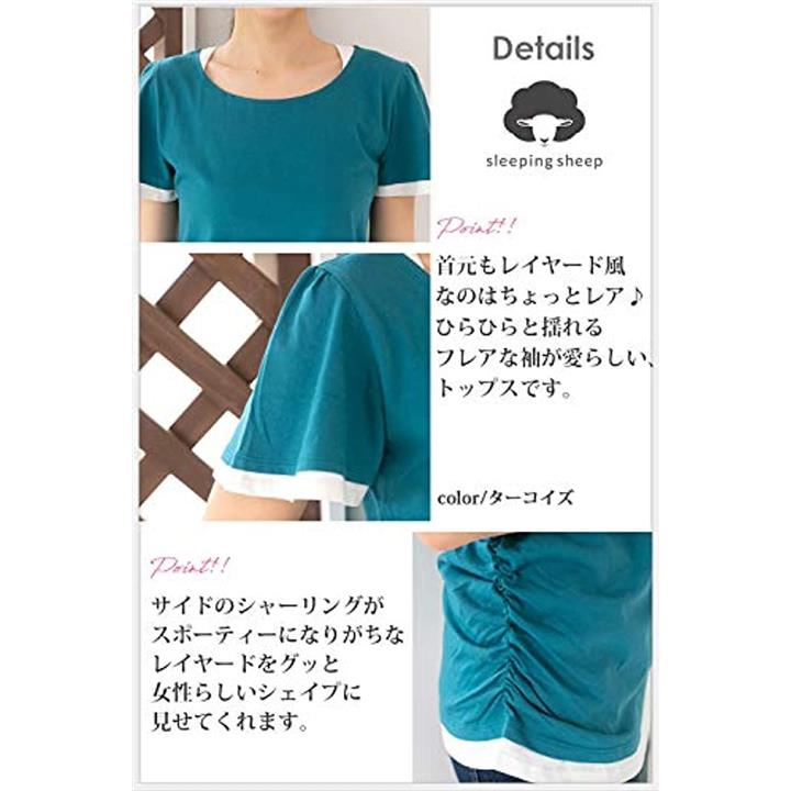 [スリーピングシープ] サイド シャーリング フレア袖 フェイクレイヤード 半袖 Tシャツ カットソー (ターコイズ, L) |