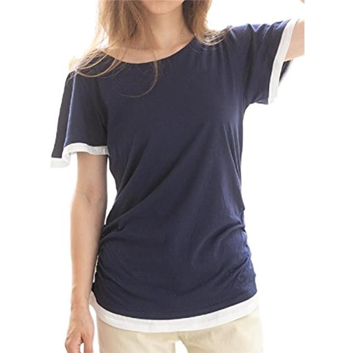 [スリーピングシープ] サイド シャーリング フレア袖 フェイクレイヤード 半袖 Tシャツ カットソー (ネイビー, M) |