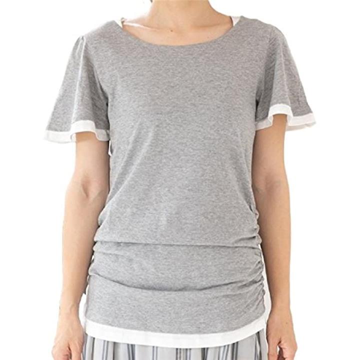 [スリーピングシープ] サイド シャーリング フレア袖 フェイクレイヤード 半袖 Tシャツ カットソー (グレー, M) |