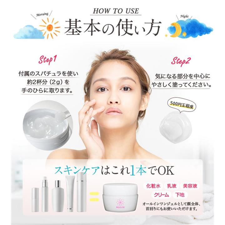 朝晩2回 洗顔後にすぐにお使いいただくと効果的。 *顎やおでこ、フェイスラインや鼻はもちろん、オールインワンジェル(化粧水、乳液、美容液、クリーム、化粧下地)のため、お顔全体、デコルテ、首、などお身体全体にもお使いいただけます。