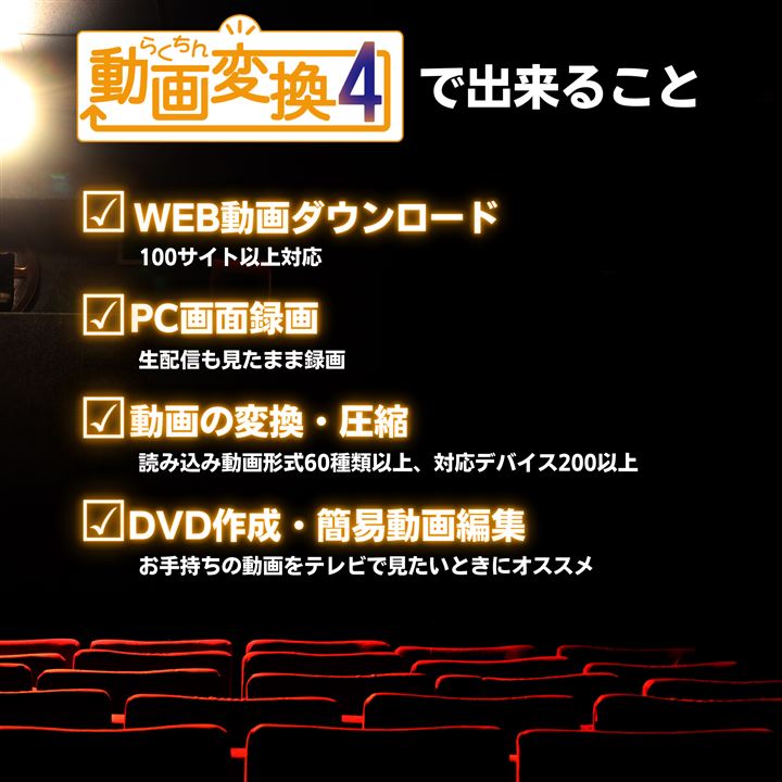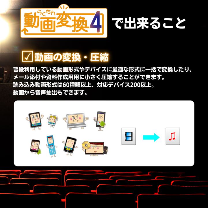 「らくちん動画変換4」は、どんな動画ファイルも読み込み、ワンクリックで好きな形式で自由自在に圧縮・変換することが出来るソフトです。