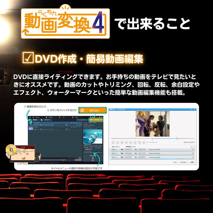 「らくちん動画変換4」はDVDプレーヤーで観ることができるDVDを簡単に作成できます。