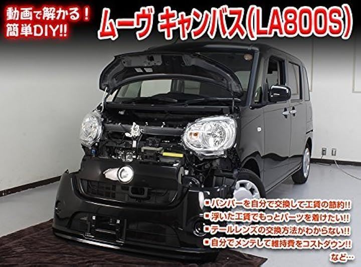 ・ルームランプ交換方法、ライト交換方法・ フロント(リア)バンパー交換方法・内張り交換方法などなど、ムーヴ キャンバス(LA800S) の 各種パーツの取外し方法や取付け方法、改造やチューニングを解説したDVD。