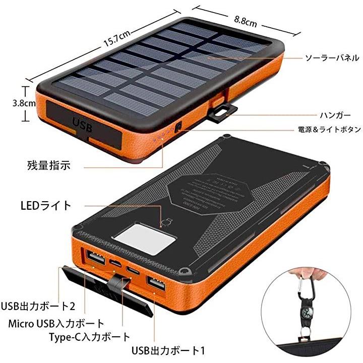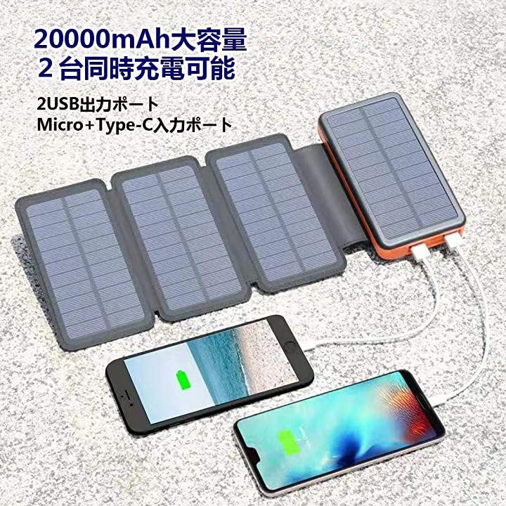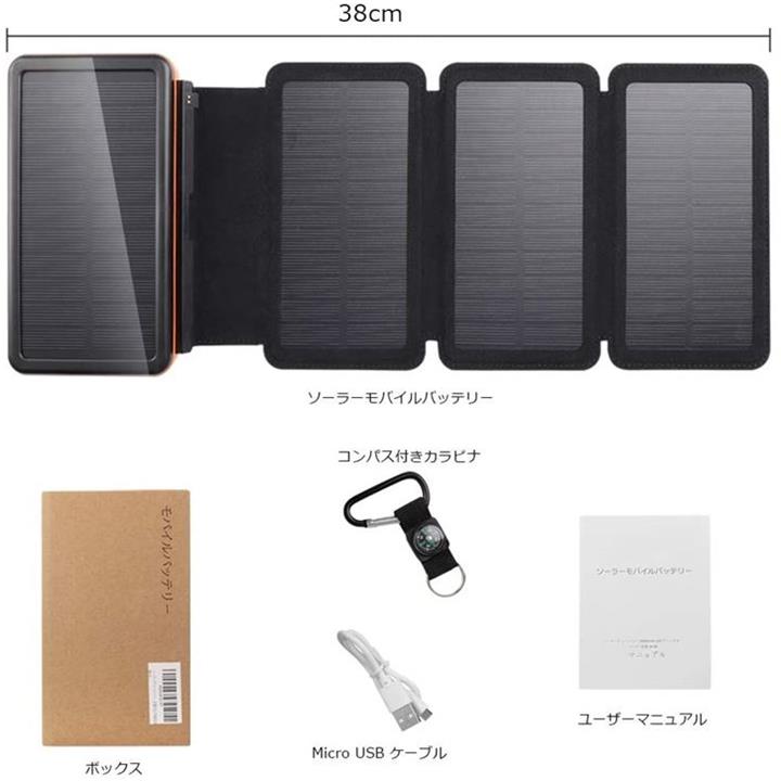 ・容量:20,000mAh(実際の容量)ソーラーバネル:5.5V/5W