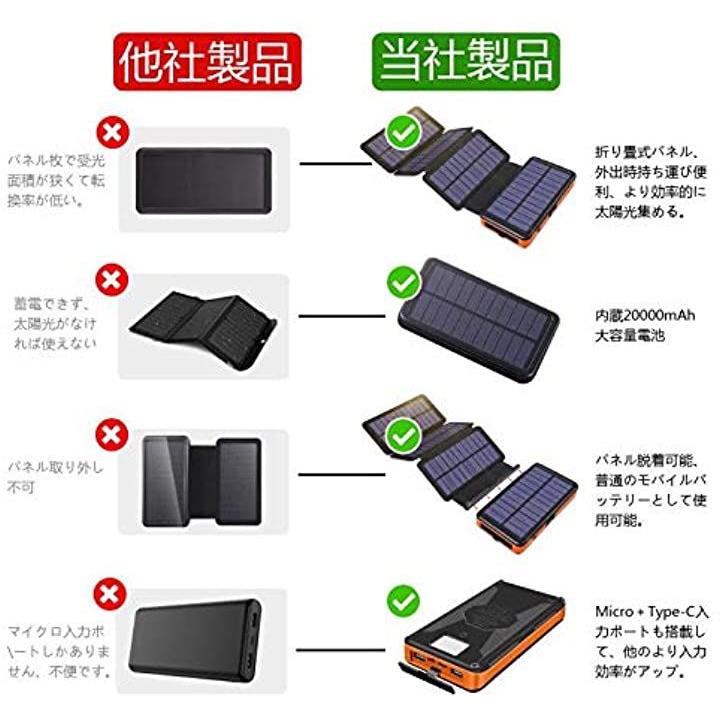 ・❤「お勧めのモバイルバッテリー」 他のソーラー充電器と比べて、このソーラーモバイルの魅力はソーラーパネル4面付き、パネル面分離可能、4USBポート(2USB出力ポート、Micro+Type-C 入力ポート)を搭載して、他のより効率がアップ。