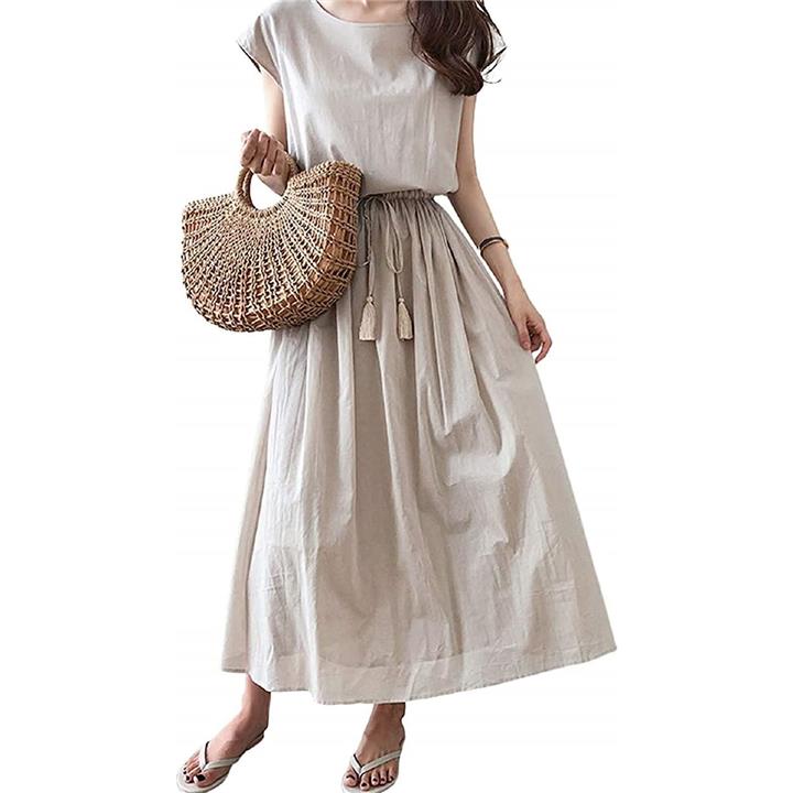 [スリーピングシープ] かわいい タッセル リボン付き フレンチスリーブ ゆったり ロング丈 シンプル ナチュラル ワンピース (3.ベージュ, 4.XXLサイズ) |