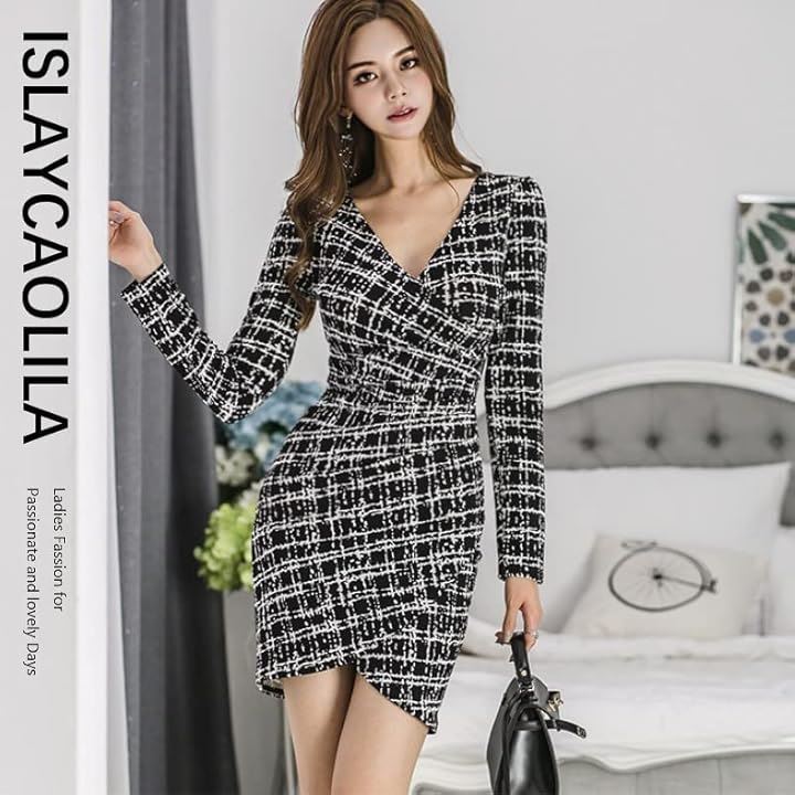 キャバドレス ミニドレス クラブドレス パーティードレス ワンピース タイト チェック プリント カシュクール 薄手 軽量 Vネック 長袖 ハイウエスト レディース C18