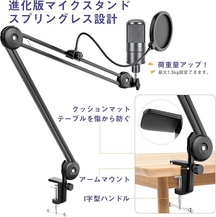 AKEIE コンデンサーマイクスタンド 「耐荷重 1.5kg」スプリングレス 卓上マイクスタンド 折りたたみ式 変換アダプター 日本語説明書付き |