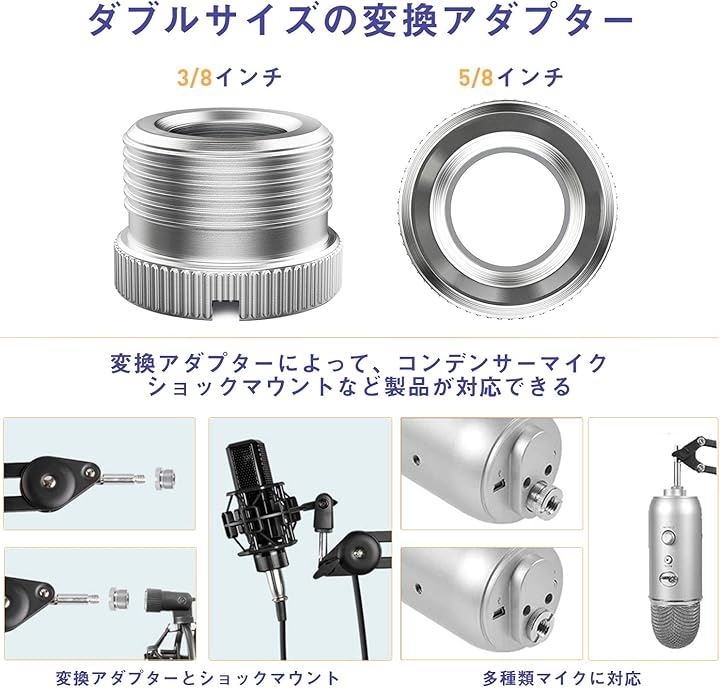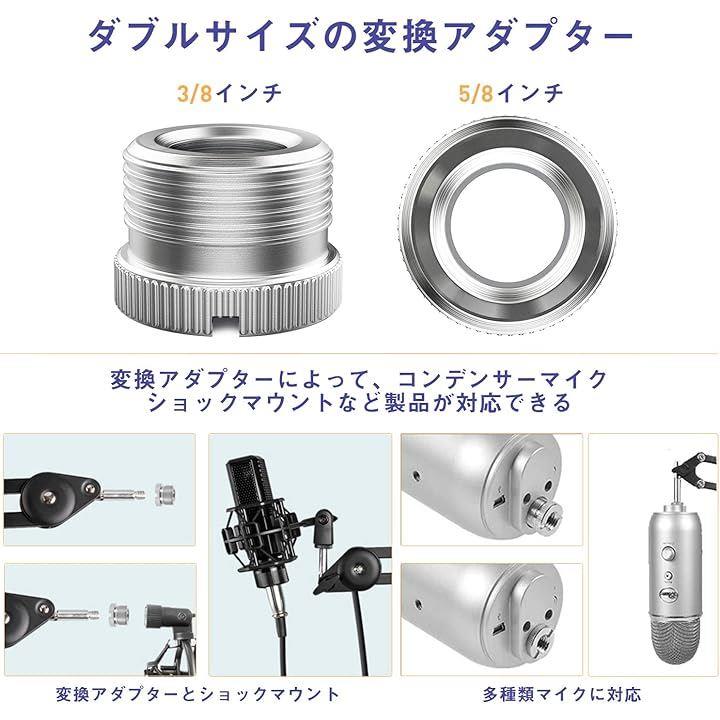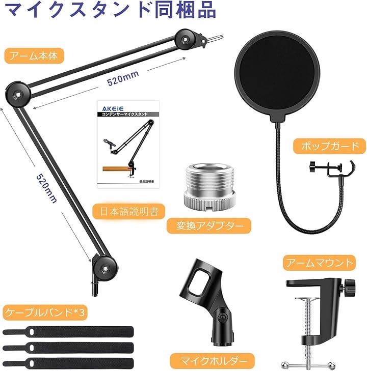 バケッジ内容:1xマイクアームスタンド1xメタル製テーブルクリップ1xプラスチック製マイククリップ1xポップガード1x日本語商品説明書1x変換アダプター3xケーブルバンド
