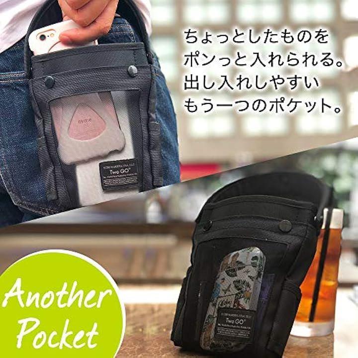 対応サイズは、大手コーヒーショップやコンビニ等の全てのサイズのテイクアウト用カップ、500mlのペットボトルなど、様々な容器に対応し、大型スマートフォンやモバイル バッテリーも収納できる大容量ポケットです。