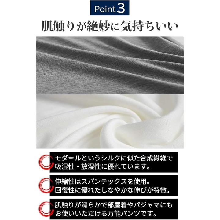 ストレスフリーでしかも肌触りが滑らかなので部屋着にもパジャマにもお使いいただける万能パンツです。