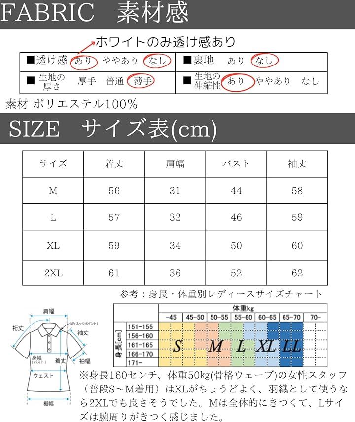 「素材」ポリエステル100% 「カラー」ホワイト、カーキ、グレー、ブラック、クリーム「サイズ(cm)」M 着丈56/肩幅31/バスト44/袖丈58 L 着丈57/肩幅32/バスト46/袖丈59 XL 着丈59/肩幅34/バスト50/袖丈60 2XL 着丈61/肩幅36/バスト52/袖丈62