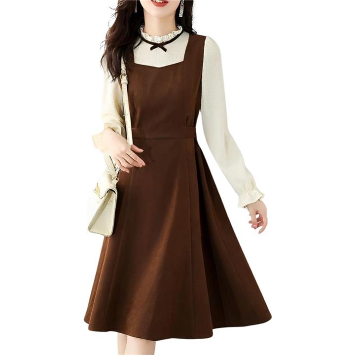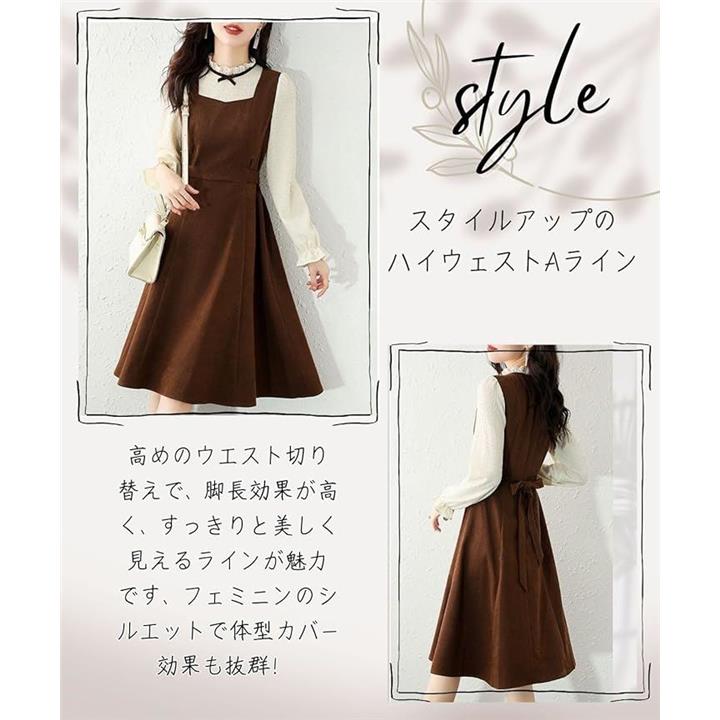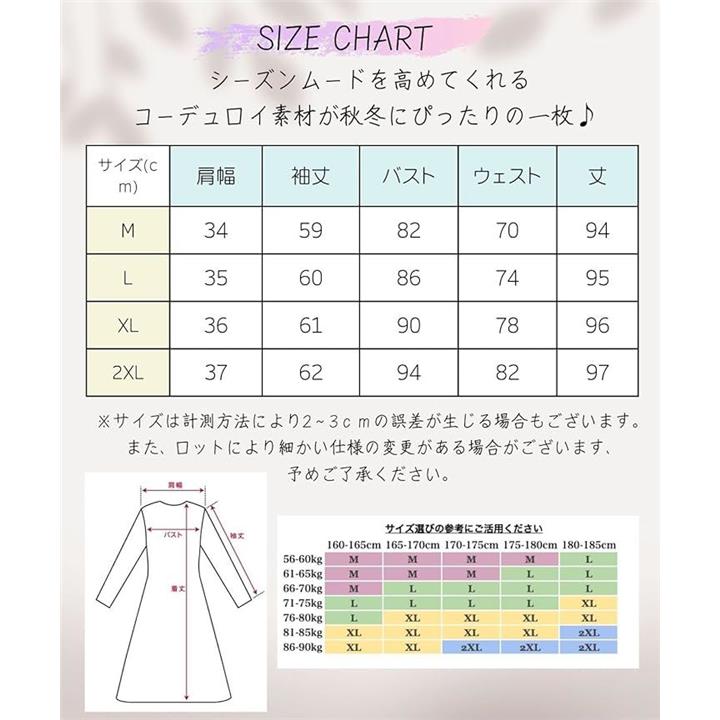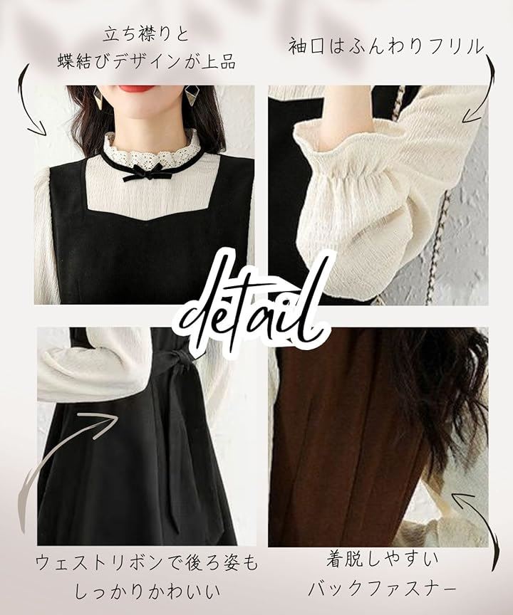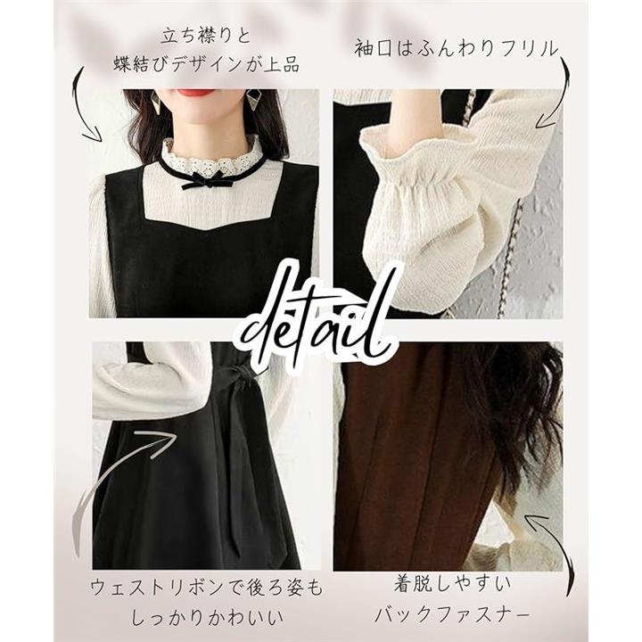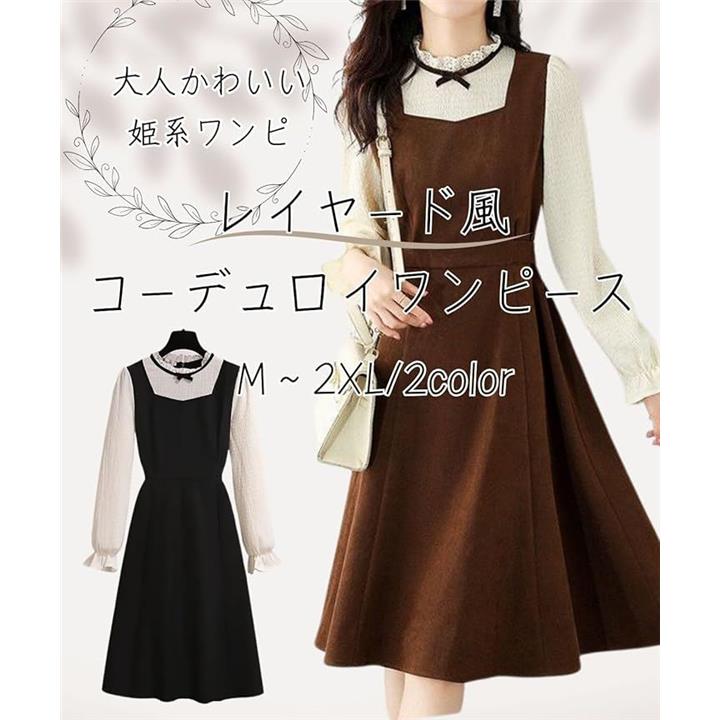 レイヤード風コーデュロイワンピース 胸元と袖のレース感とフリルの立ち襟りと蝶結びデザインが上品でエレガントな雰囲気を出してくれる大人かわいい姫系ワンピ ウェストリボンで後ろ姿もしっかりかわいい。 高めのウエスト切り替えで、脚長効果が高く、すっきりと美しく見えるラインが魅力です、フェミニンのシルエットでシーズンムードを高めてくれるコーデュロイ素材が秋冬にぴったりの一枚。