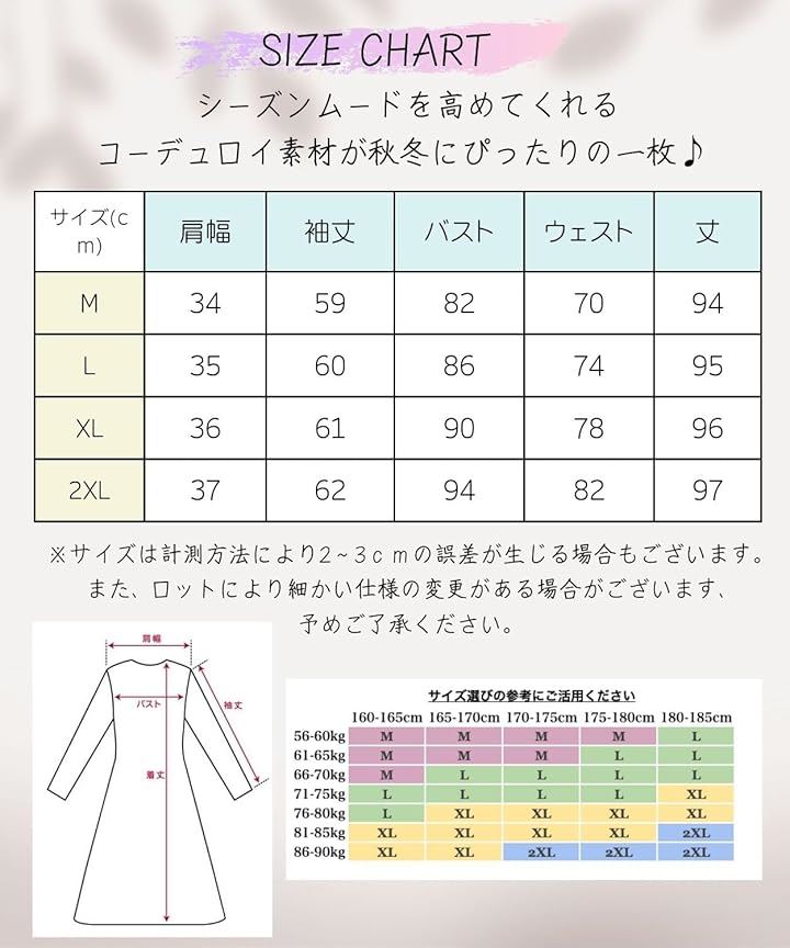 「2XL」肩幅37/袖丈62/バスト94/ウェスト82/丈97