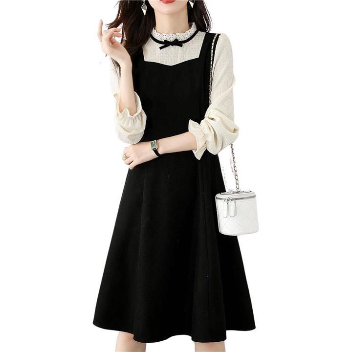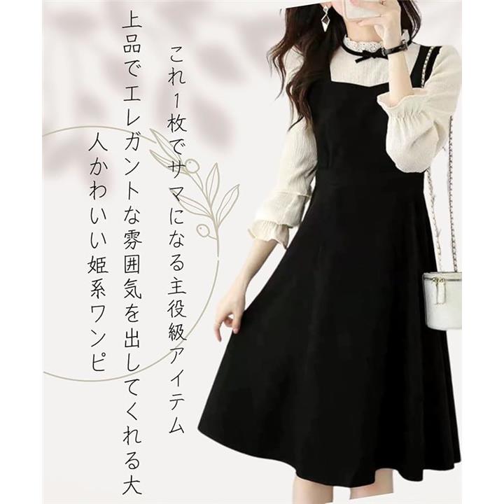 秋冬の季節にぴったりな「姫系xかわいい」ドッキングワンピースが登場。このワンピースは、ブラウスとスカートを組み合わせたようなセットアップ風のデザインで、リボン付きの立ち襟がエレガントな雰囲気を演出。
