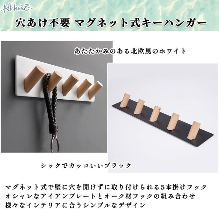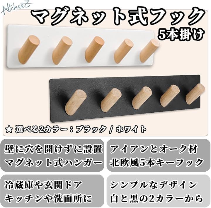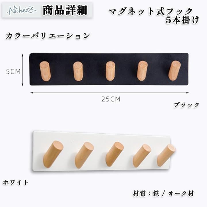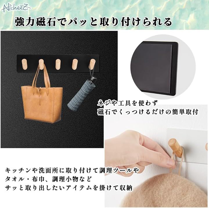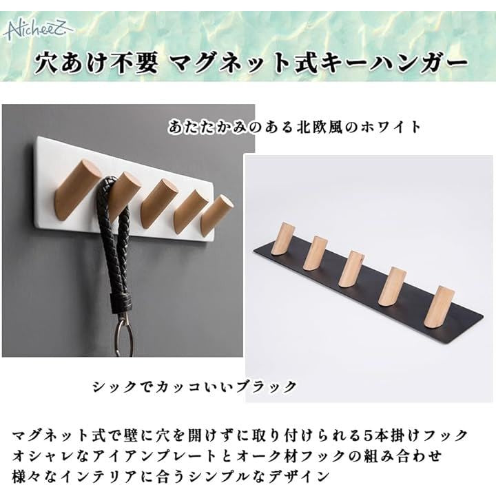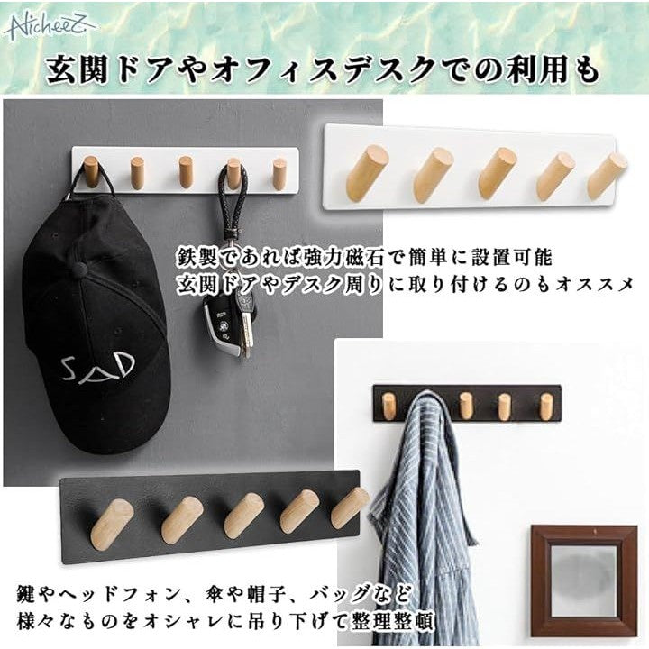 マグネット式 キーハンガー キッチンツールフック カバン掛け 強力磁石 スタリッシュ オシャレ 北欧風 炭素鋼 無垢材 5本掛け