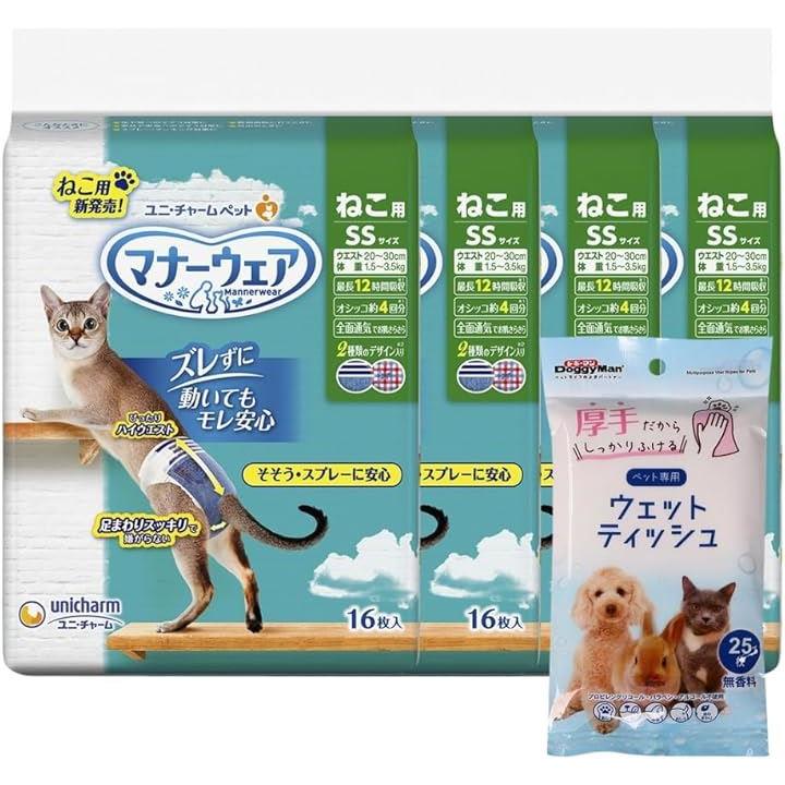 まとめ商品64枚+25枚ペット専用ウェットティッシュ付き ドギーマン マナーウェアねこ用SS 猫 おむつ 16枚x4コ