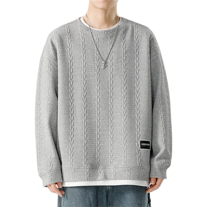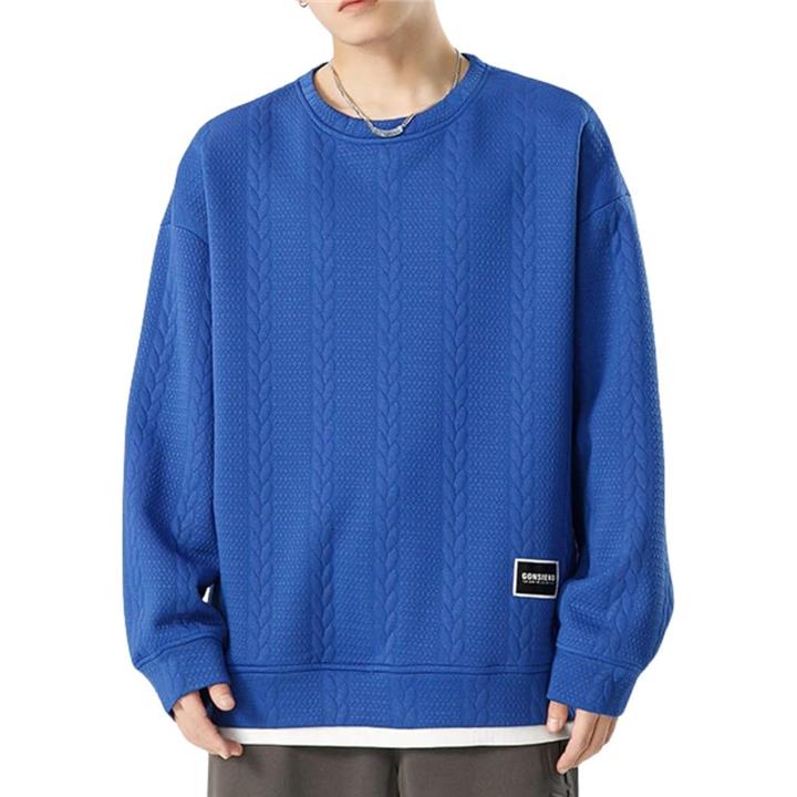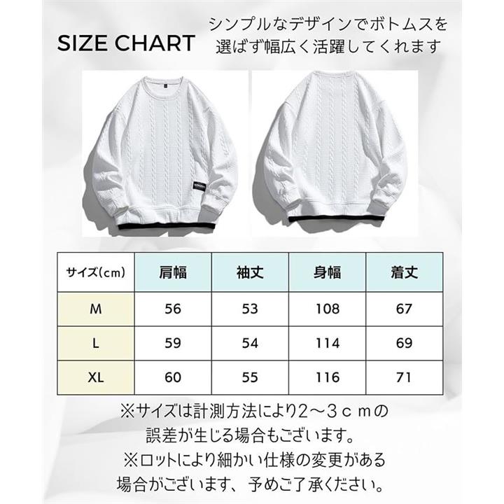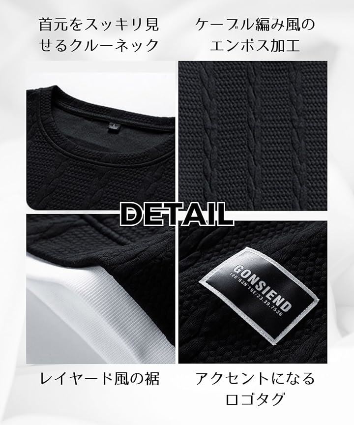 襟元と裾がレイヤード風になっているフェイクレイヤードデザイントレーナー ニットのようなケーブル編みの凹凸があるエンボス素材なのでこなれ感のある大人なカジュアルスタイルにオススメのメンズ長袖トレーナー。