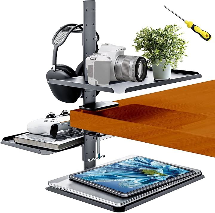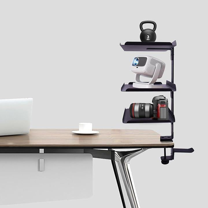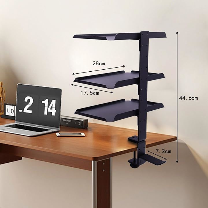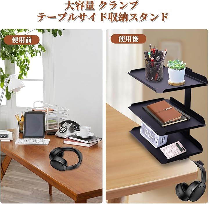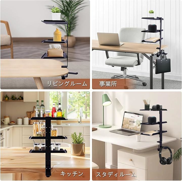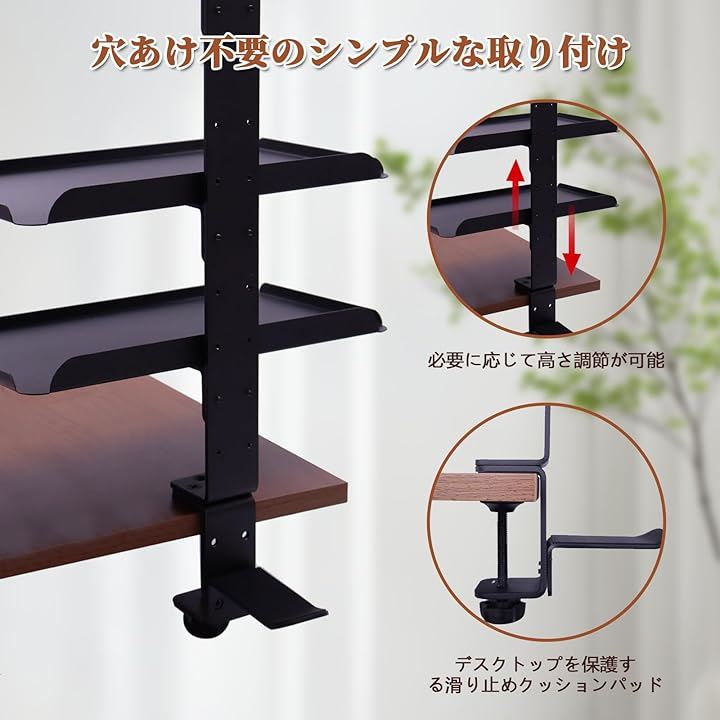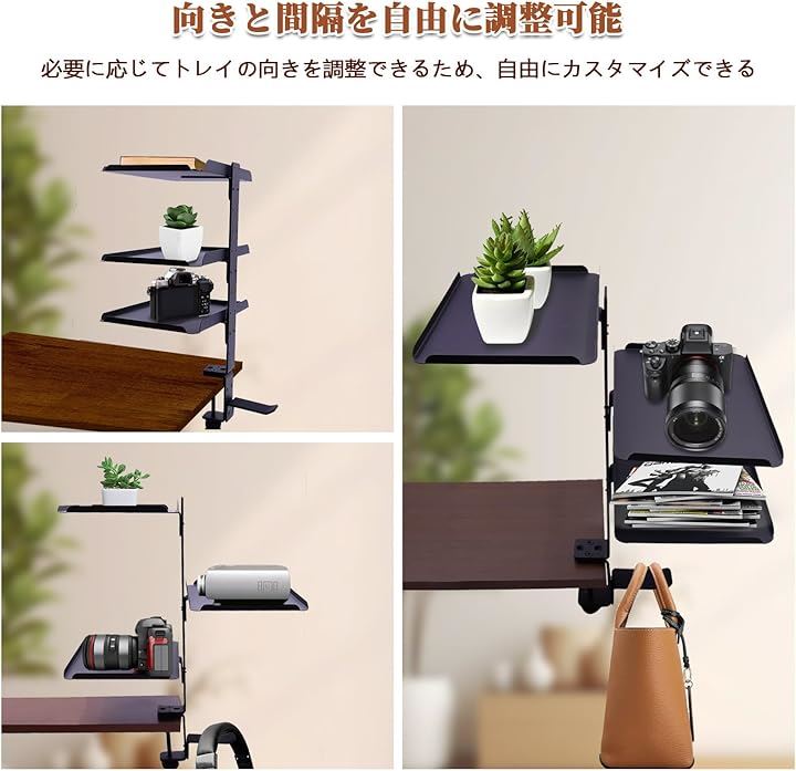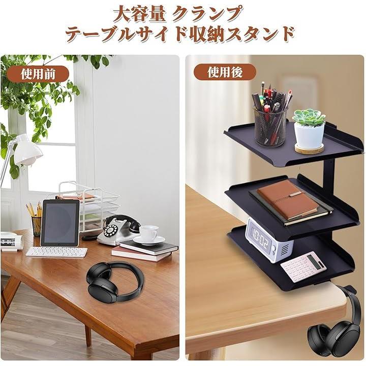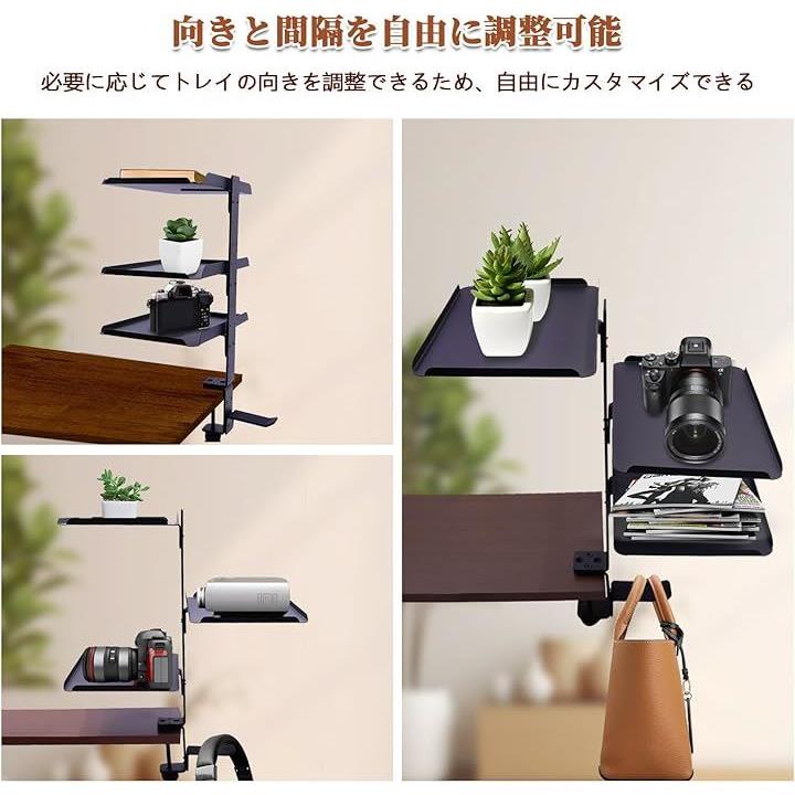 トレイアームスタンド デスクサイド 収納 クランプ式デスクラック 3段収納棚 高さ調節可能 省スペース 穴あけ不要 工具付属・日本語説明書 オフィス 自宅用 デスク整理 小物収納