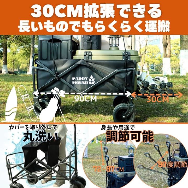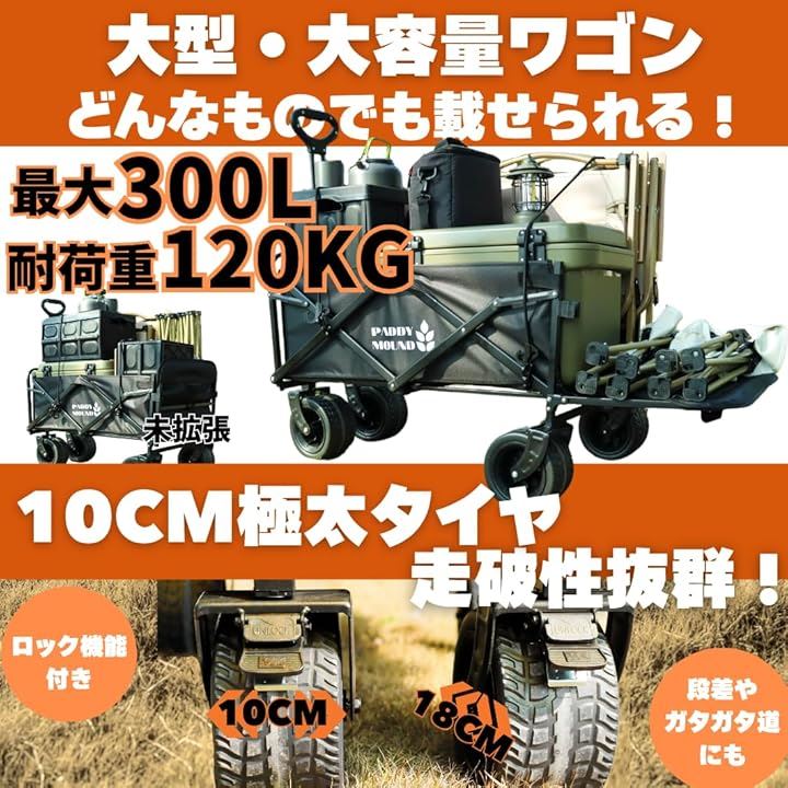 アウトドアジャーナリスト推奨 大容量300L 極太10cm タイヤ キャリーカート ワゴン 長物対応 自立 コンパクト 収納 台車 キャンプ