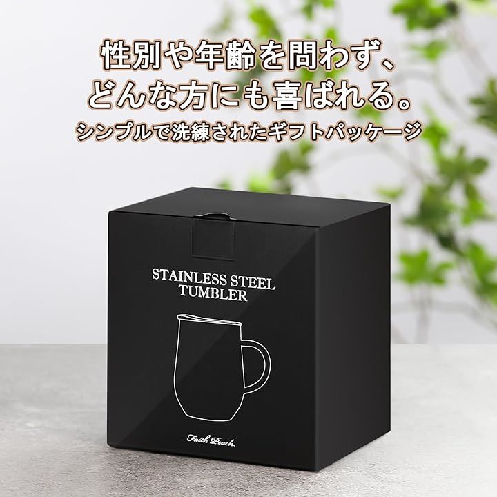 「ギフトにおすすめの高級感あふれる仕様」 シンプルながらも上質感のある黒い化粧箱入りで、銀色で描かれたタンブラーのシルエットが目を引きます。