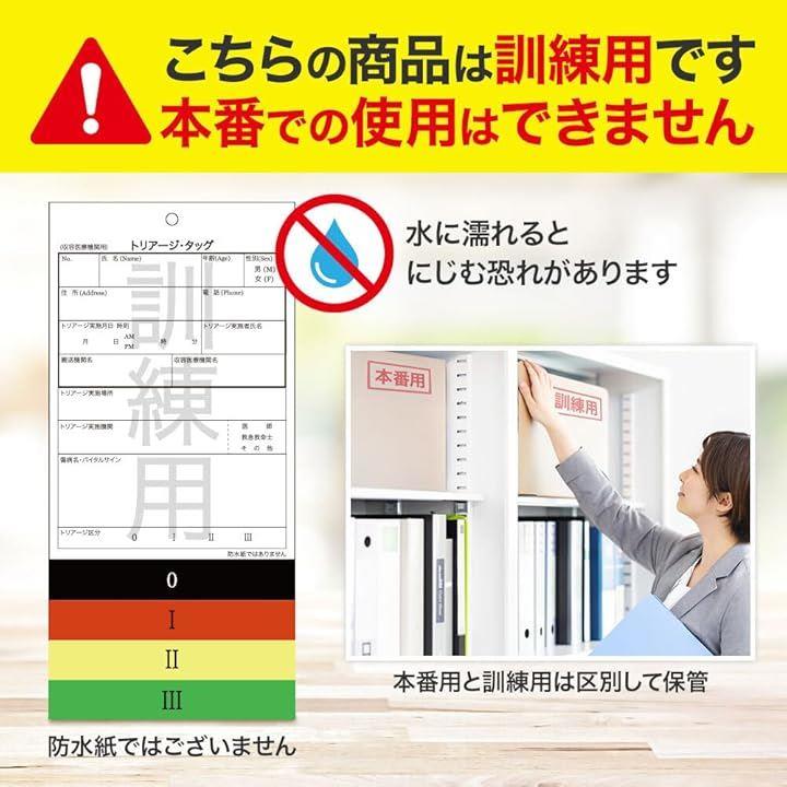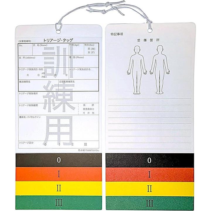トリアージタッグ 訓練用 100枚入 練習用 トリアージタグ 厚生労働省 旧厚生省標準化規格対応 非防水 救急 治療 搬送 災害 医療 講習 研修 配布 再トリアージ ゴム紐付き