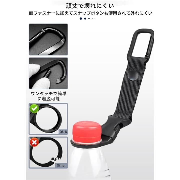 「心強い相棒」TOPIKEボトルホルダーはテープ、ボタン、カラビナ3種の留め具がペットボトルをしっかり固定されています. 高い支持力があり、気づいたら外れていたというようなことにはならないと思われます。