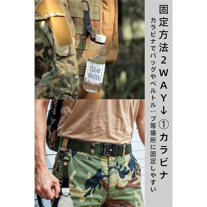 「固定方法2WAY」固定方法2WAYなペットボトルホルダーです。(1)カラビナでバッグやベルトループなど様々な場所に固定できます。
