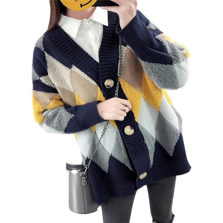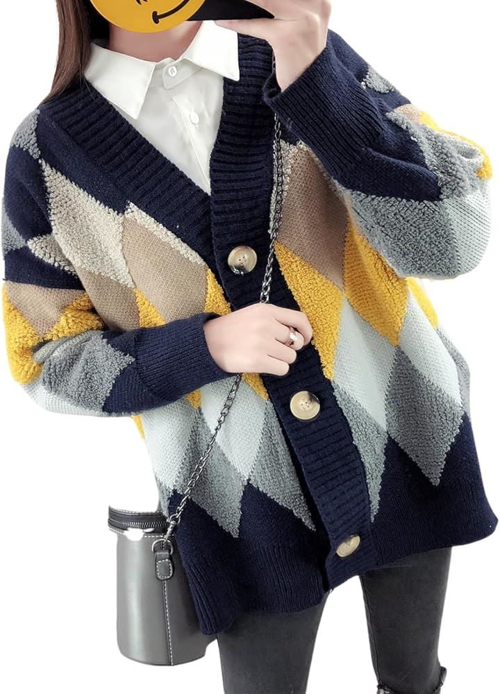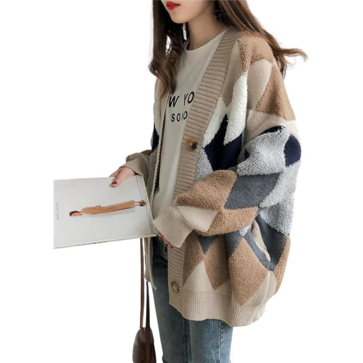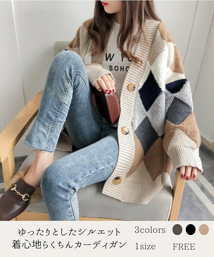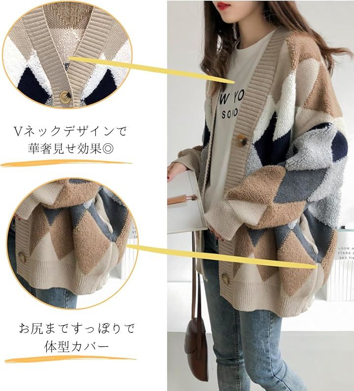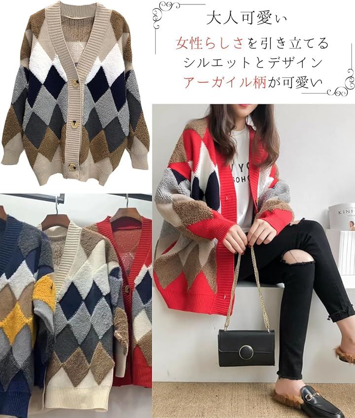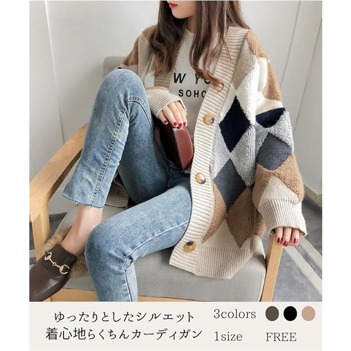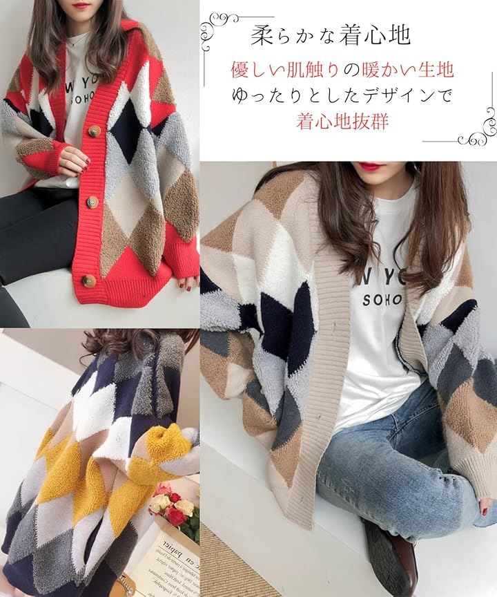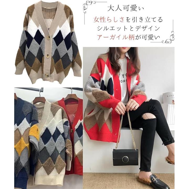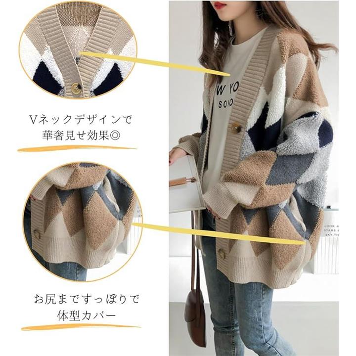 ほっこり暖かい ニット レディース ゆったり 体型カバー カーディガン おしゃれ 防寒 長袖 大きいサイズ ふわふわ もこもこ アーガイル 春 秋 冬