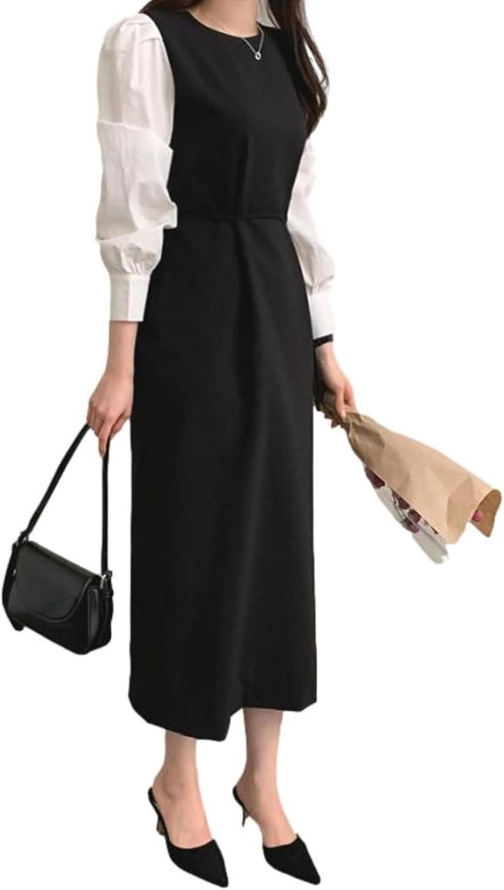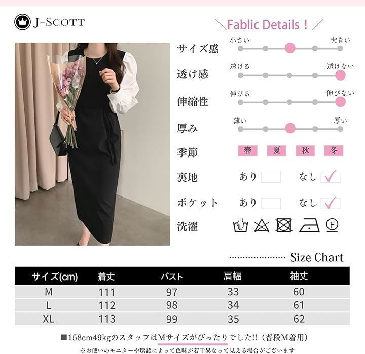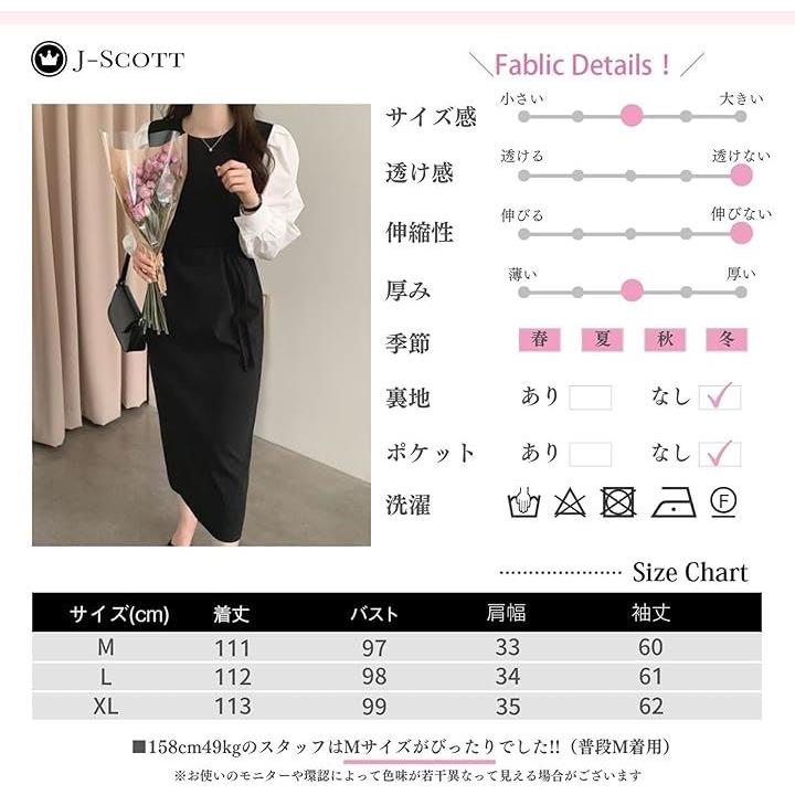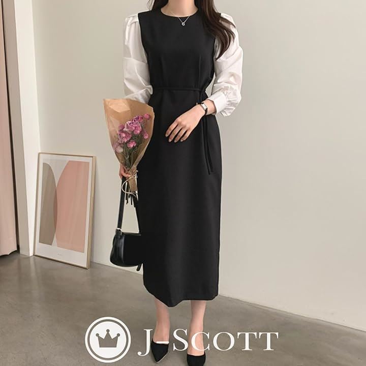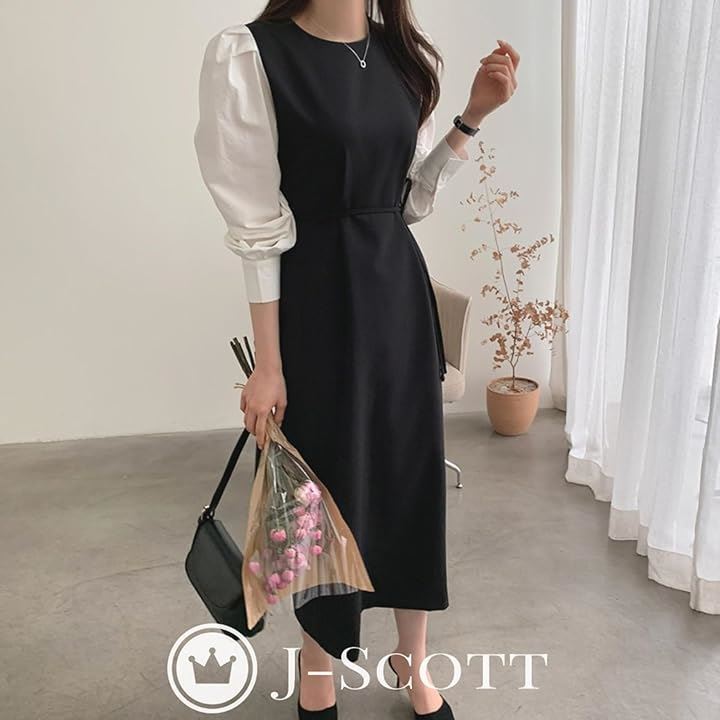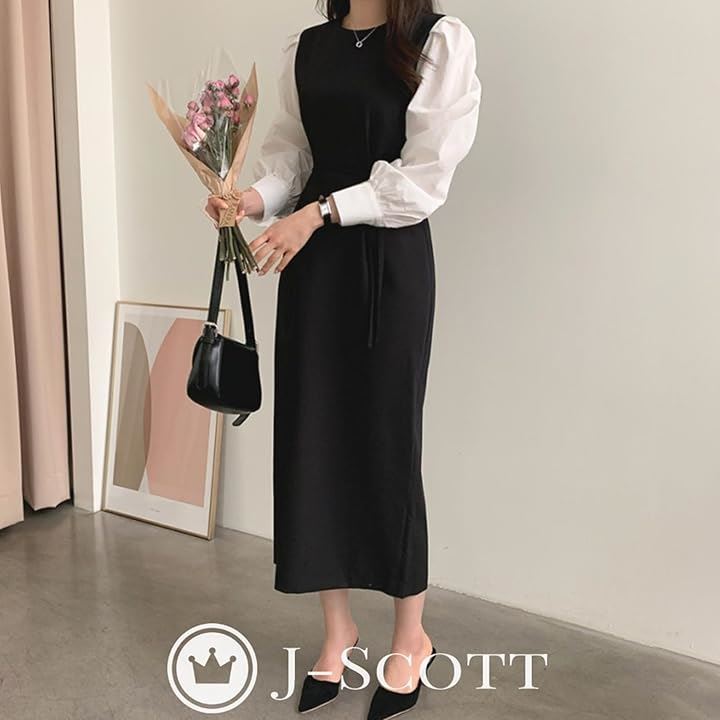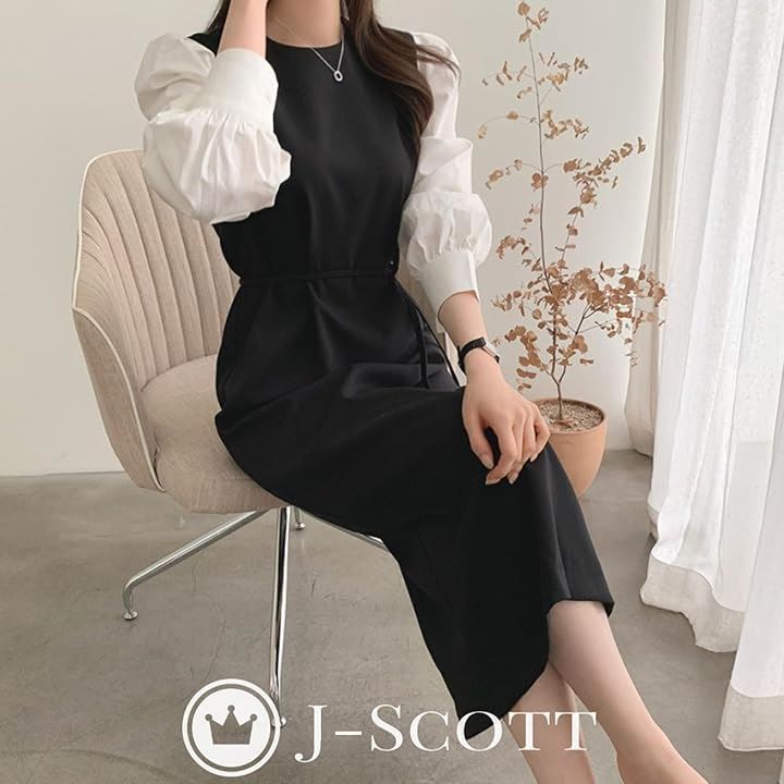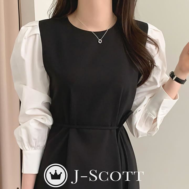 ジェイスコット レイヤード風ワンピース 異素材MIX ぽわん袖 ロング丈 ウエストマーク バイカラー 綿混
