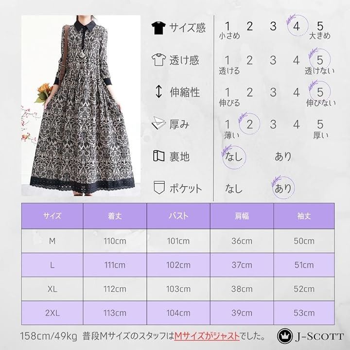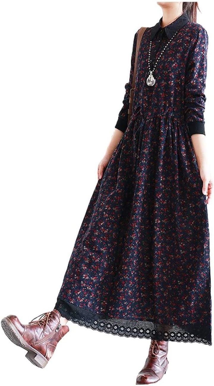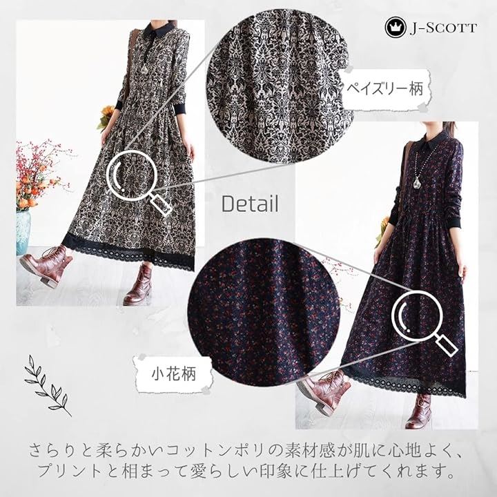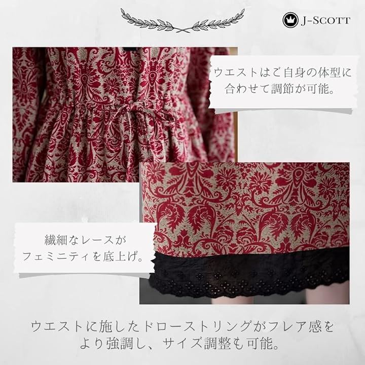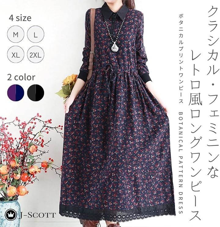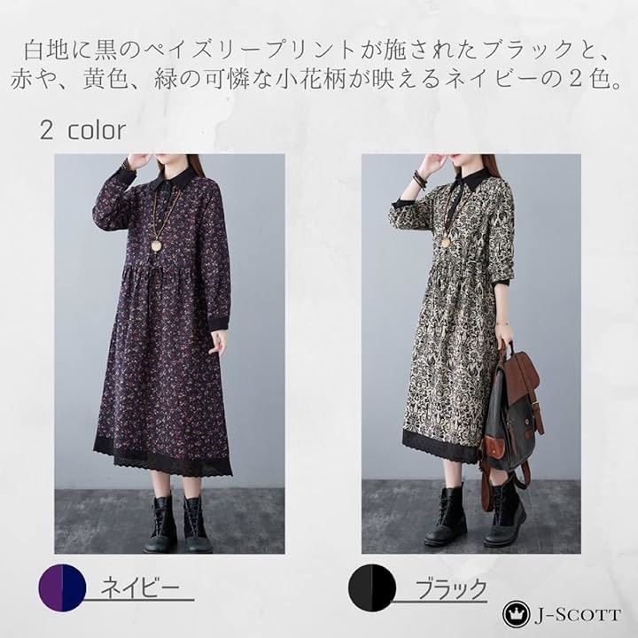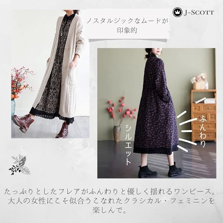 幾何学柄 花柄 レトロ風ロングワンピース シックカラー レース ウエストゴム ミモレ丈 レディース