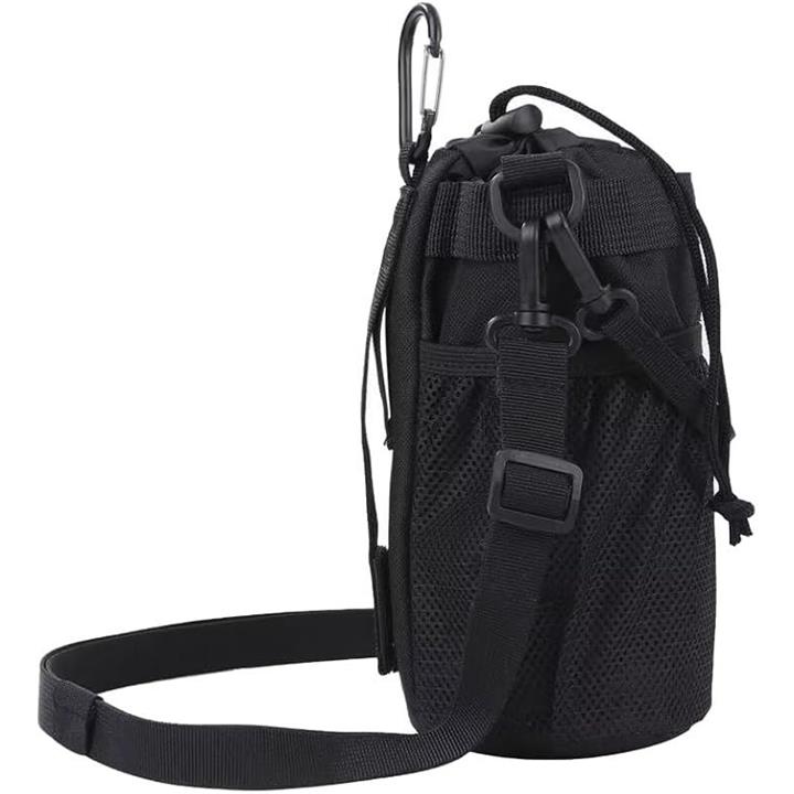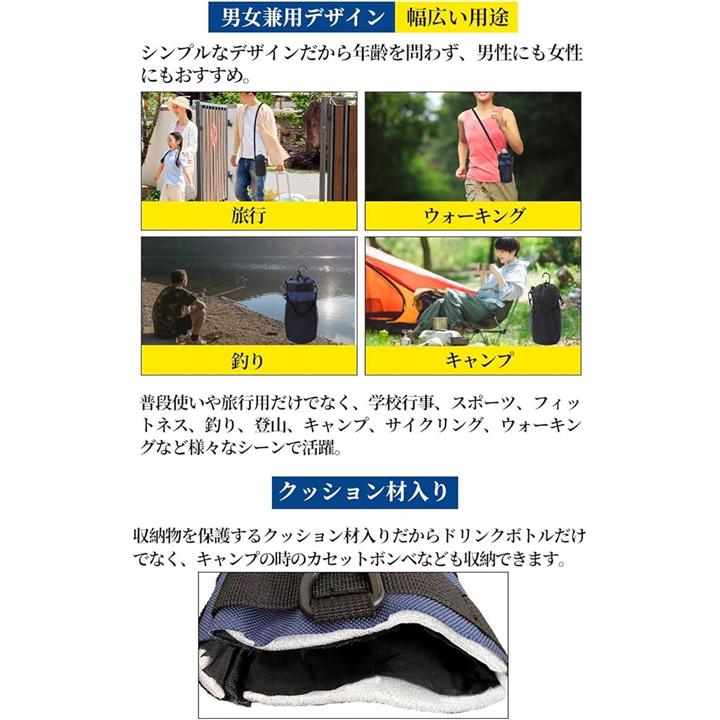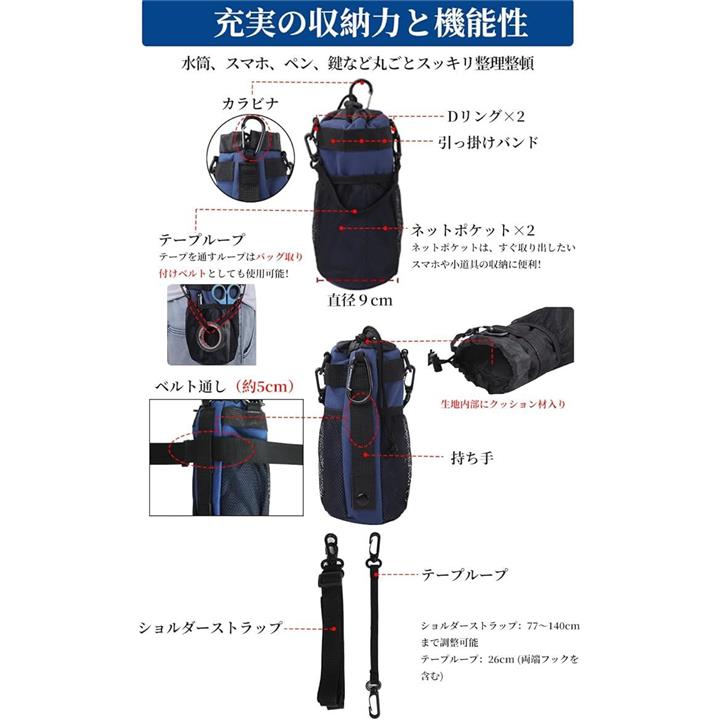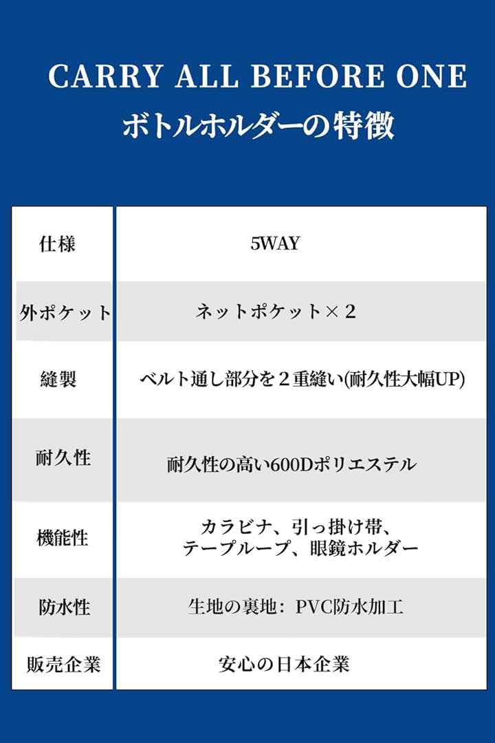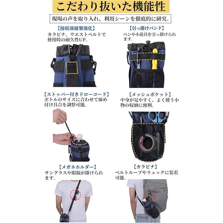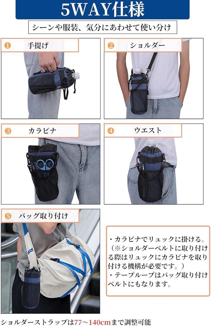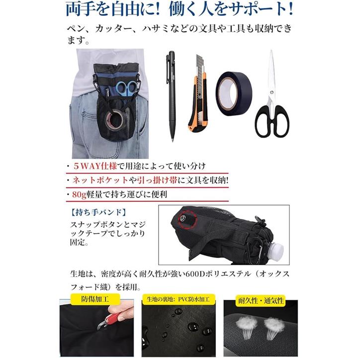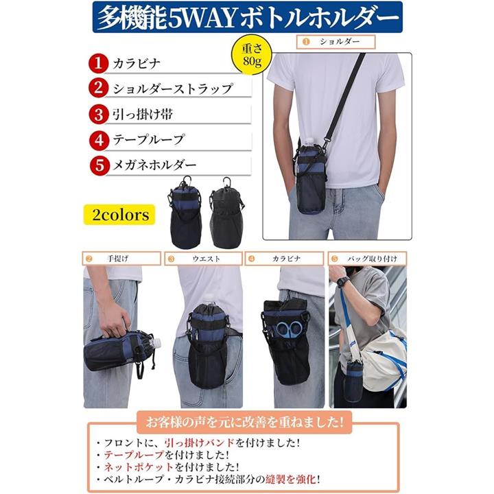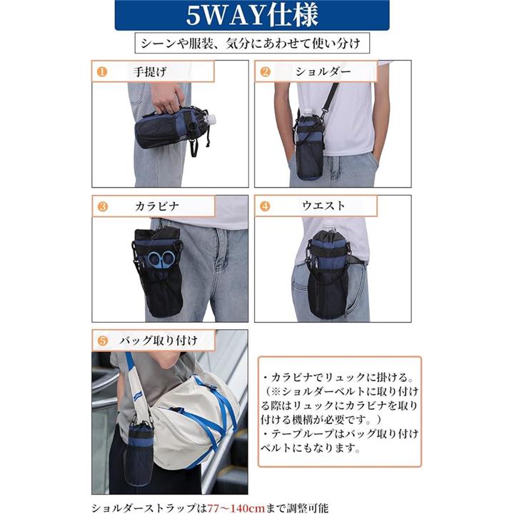 多機能 5way ボトルホルダー ドリンクホルダー 水筒ポーチ ペットボトル 収納 バッグ カラビナ ショルダーストラップ ネットポケット 引っ掛け帯付き 撥水・防傷加工