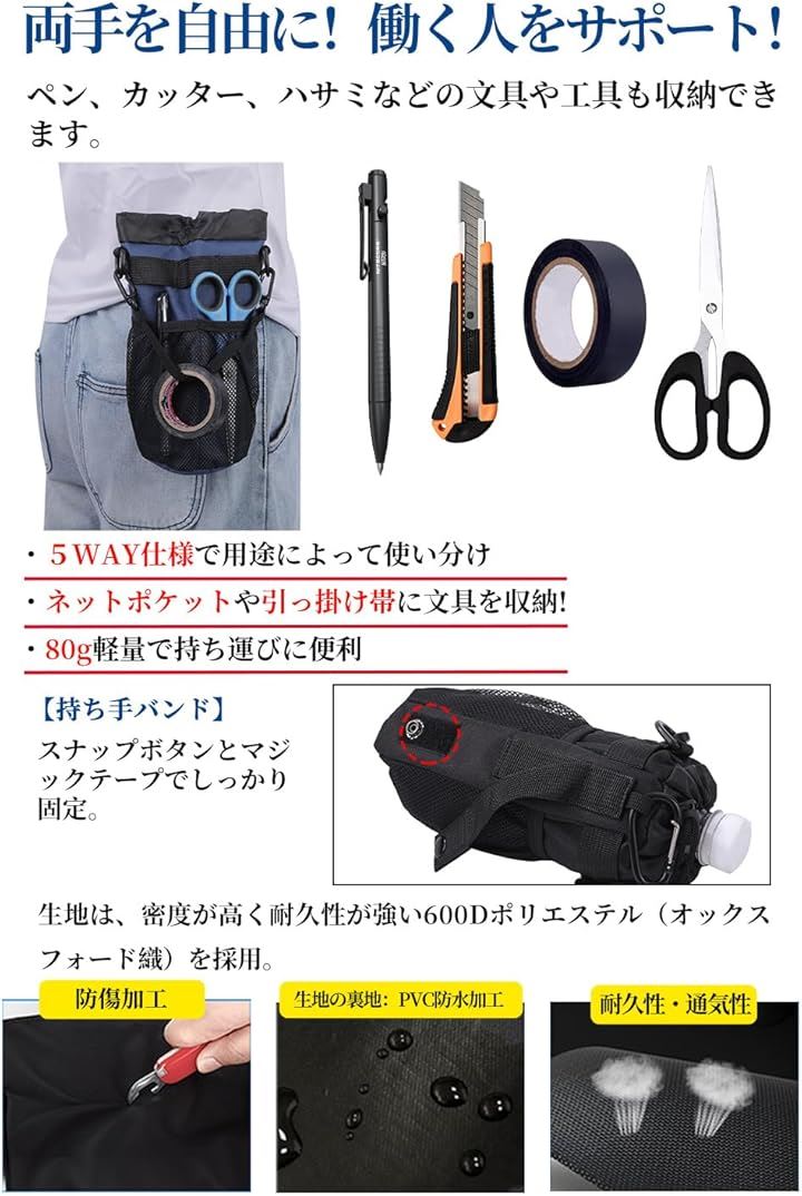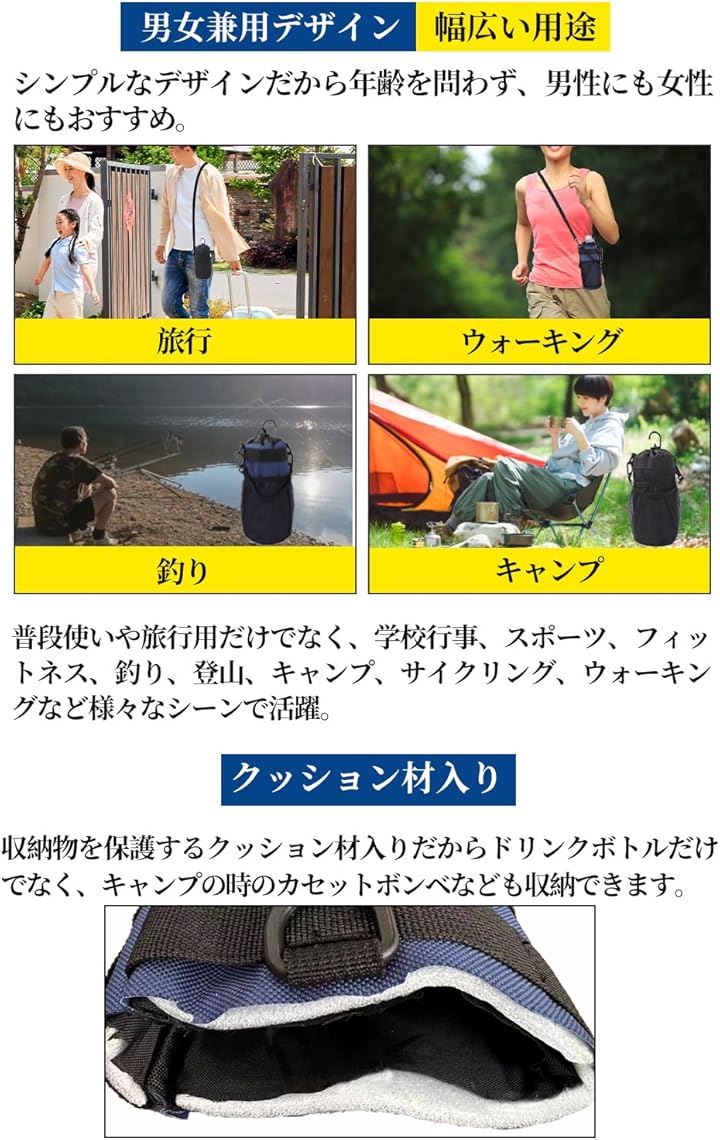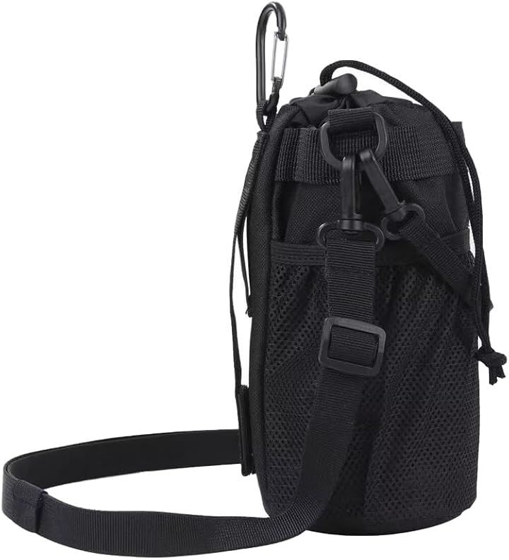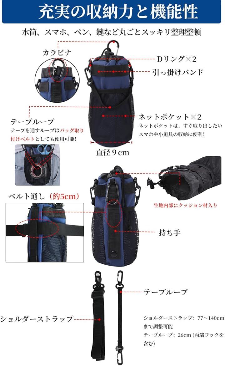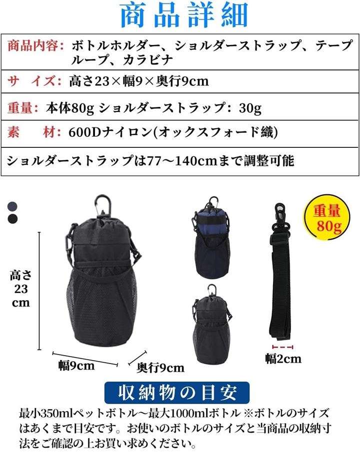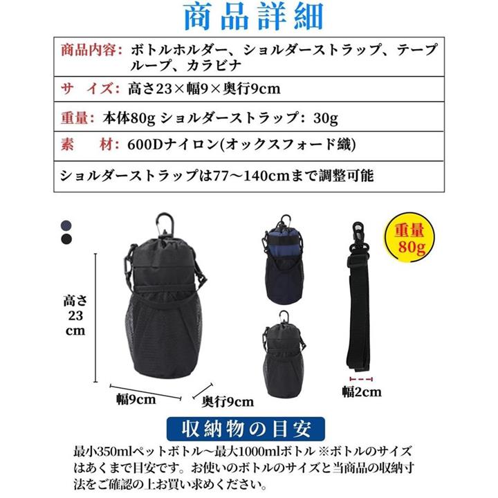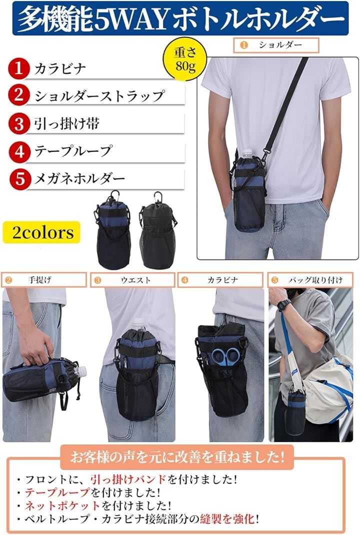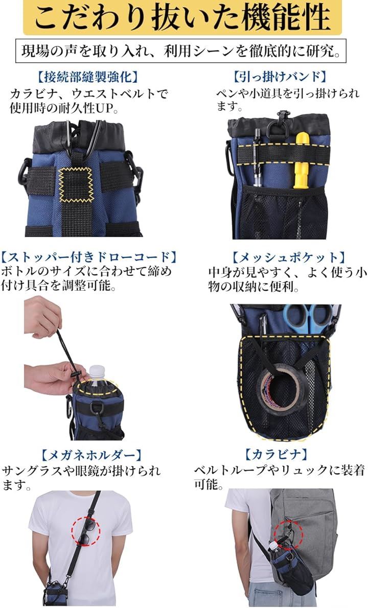 多機能 5way ボトルホルダー ドリンクホルダー 水筒ポーチ ペットボトル 収納 バッグ カラビナ ショルダーストラップ ネットポケット 引っ掛け帯付き 撥水・防傷加工