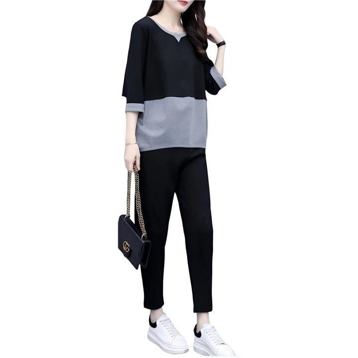半袖のクルーネックトップスとアンクル丈のボトムスの2点セットです。