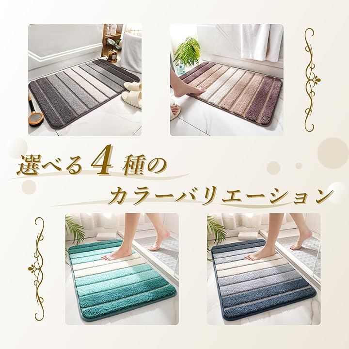 「サイズとカラー」 サイズ:40x60cm カラー:グレー、ベージュ、ライトブルー、ブルー 「用途」 お風呂上がりの足元に 洗面所やキッチンでも使用可能 ペット用マットとしても利用可能 「ご使用方法」 床面を清潔にした後、滑り止め面を下にして設置してください。
