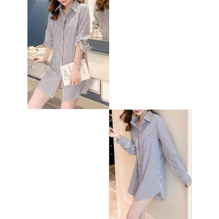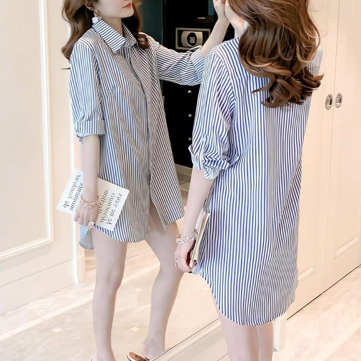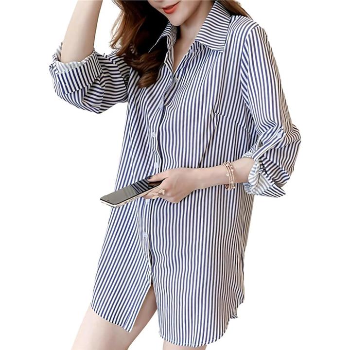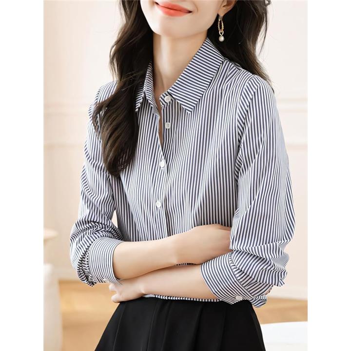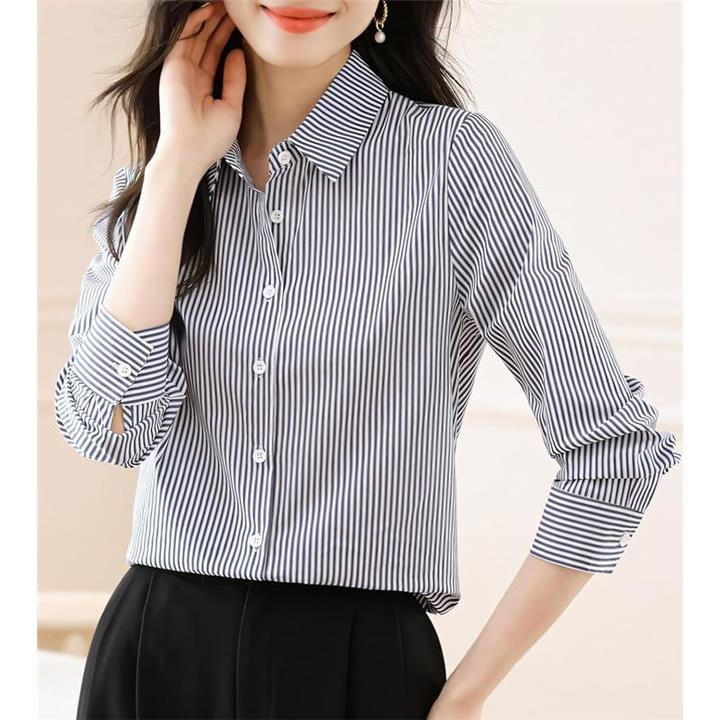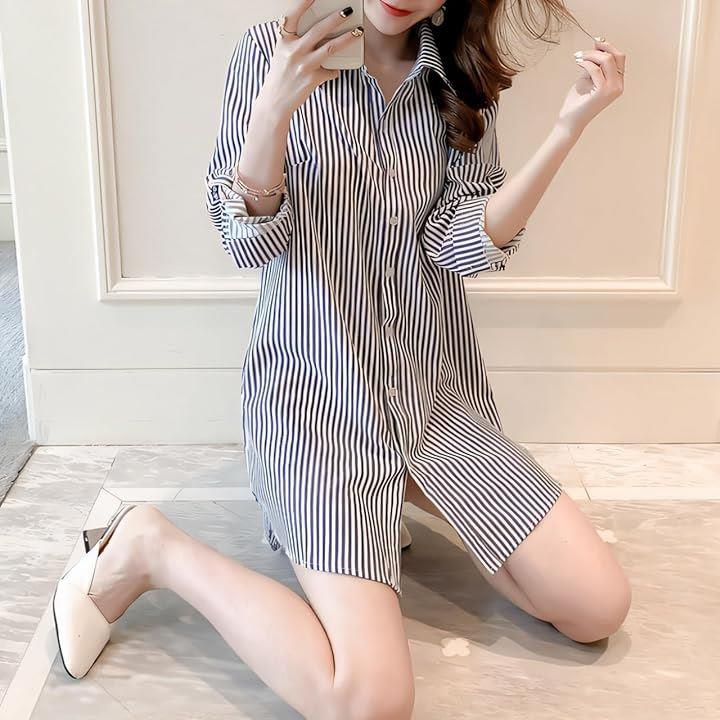 シャツ ブラウス ストライプ 長袖 ワイシャツ カッターシャツ 長め レディース レギュラー カラー 襟付き トップス Yシャツ ボタン