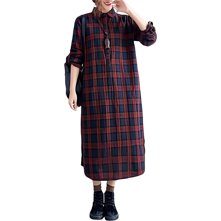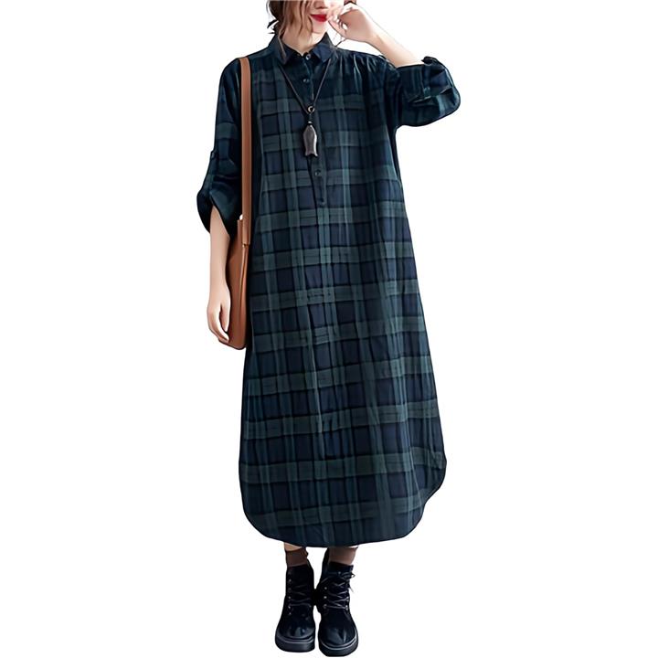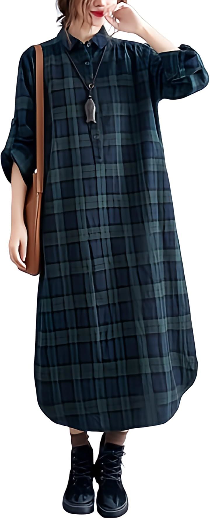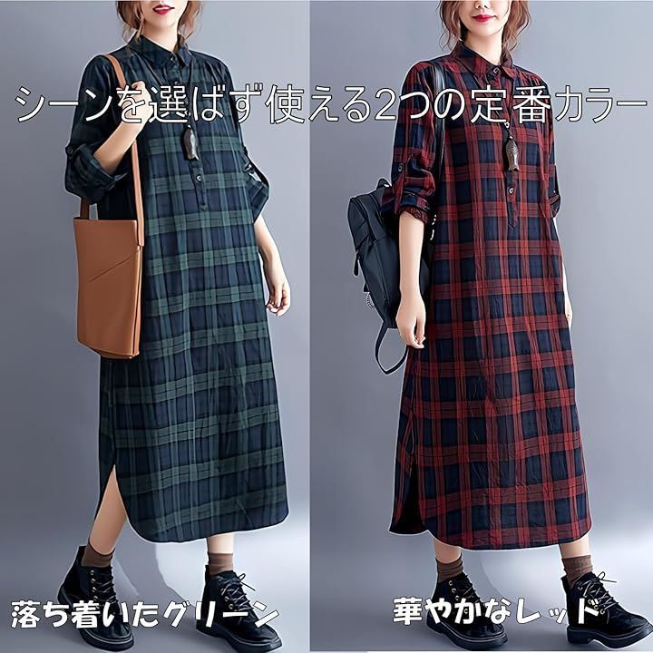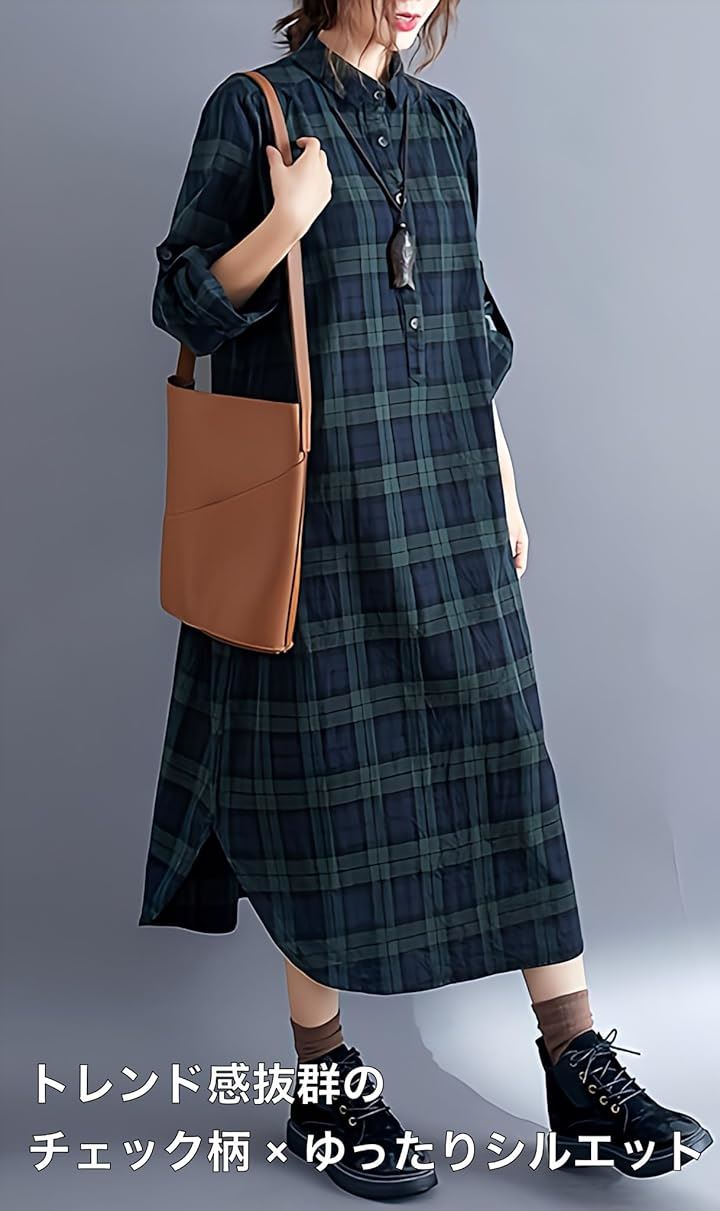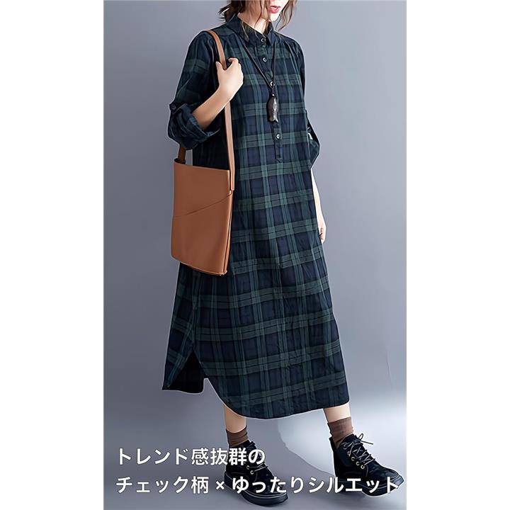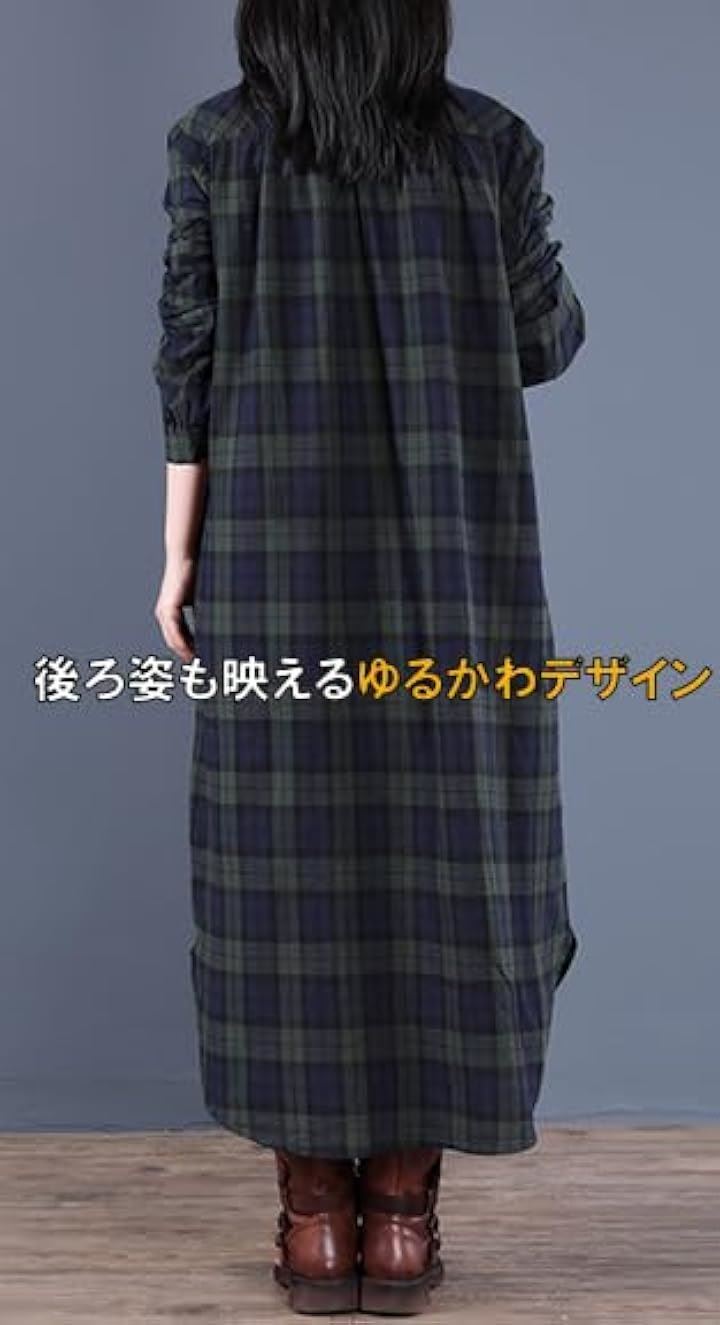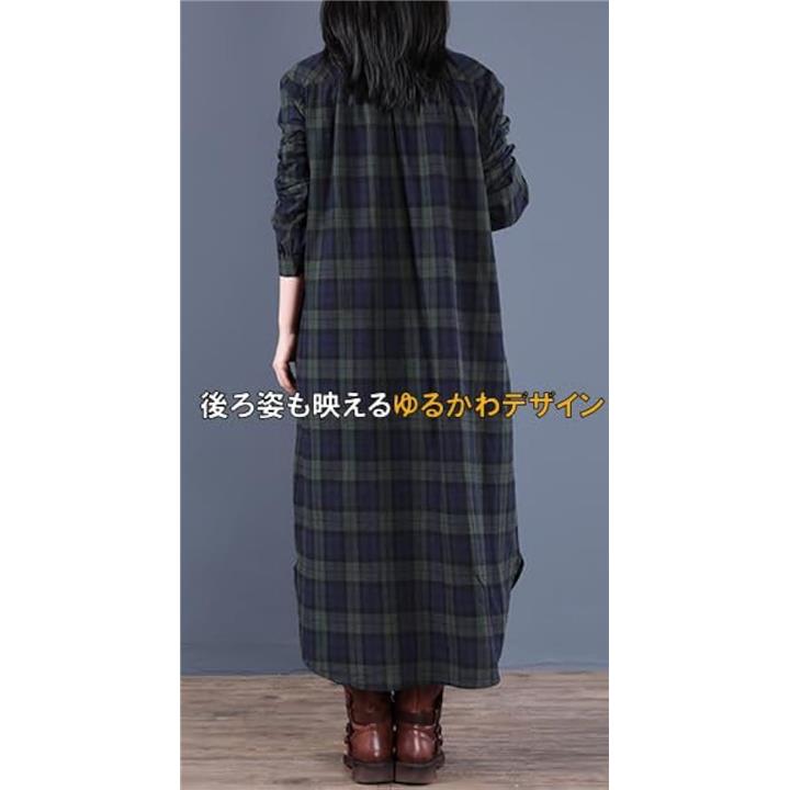 チェックワンピース レディース ロング丈 ゆったり 体型カバー 長袖 春 秋 冬