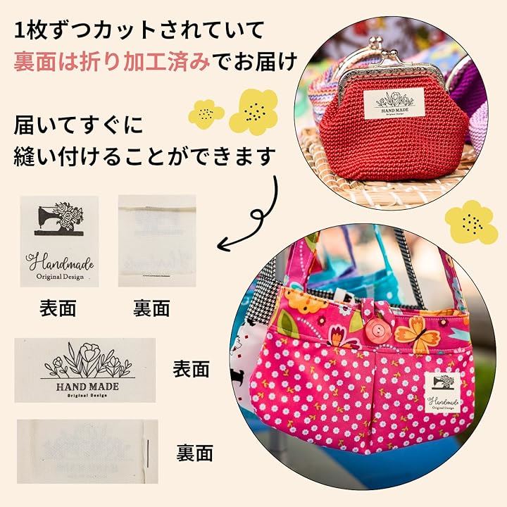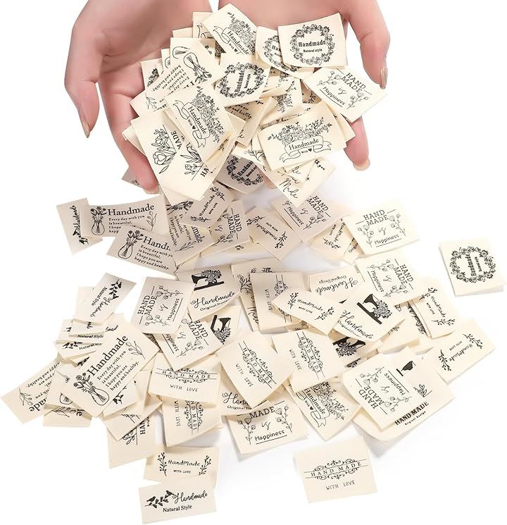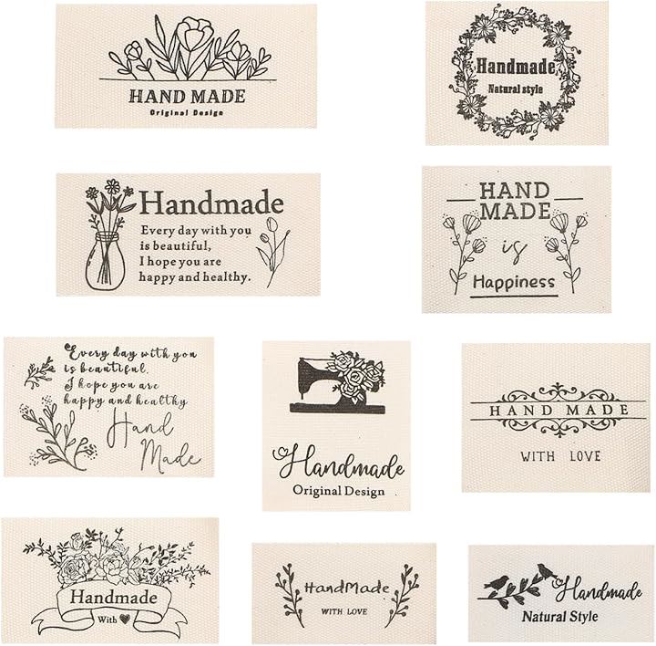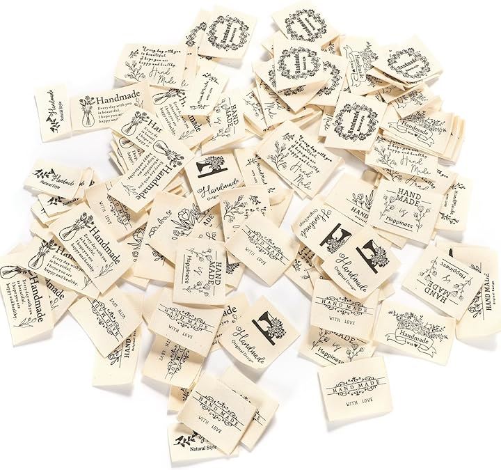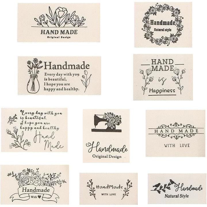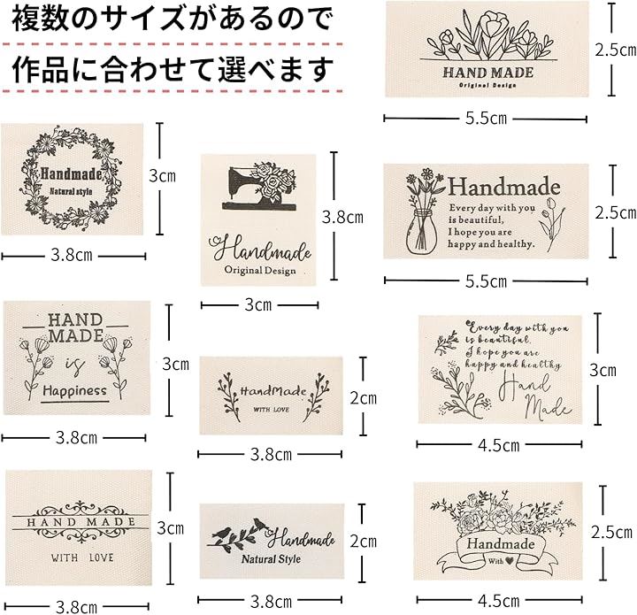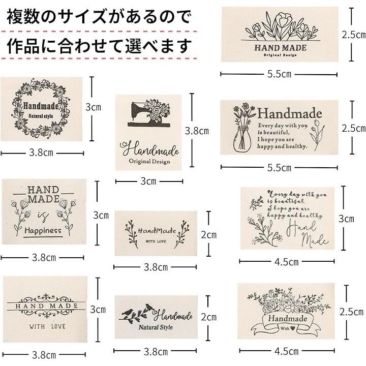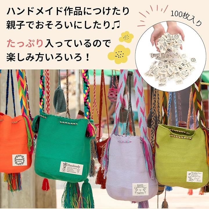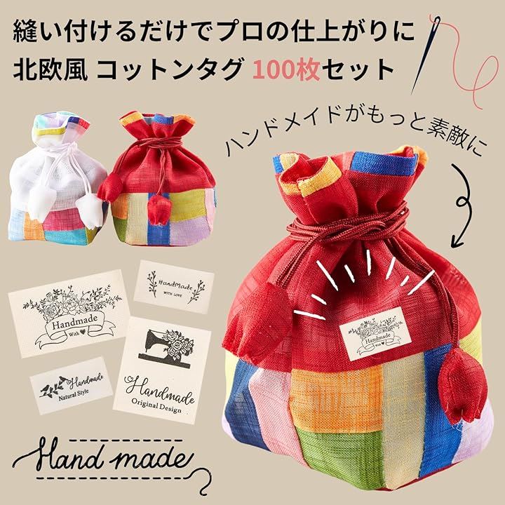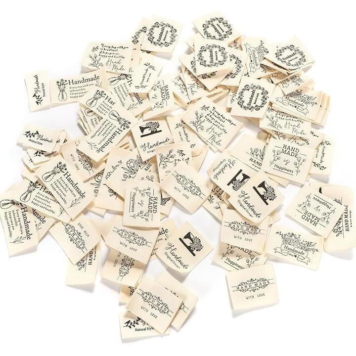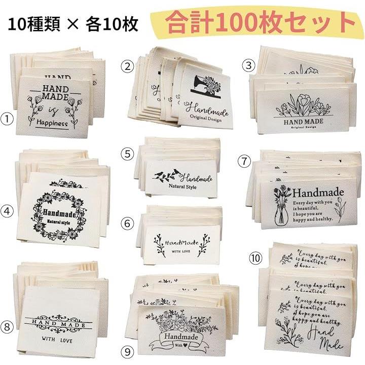 ハンドメイド布タグ 100枚セット 10種x10枚 英字入り コットン 北欧風 ミックスアソート