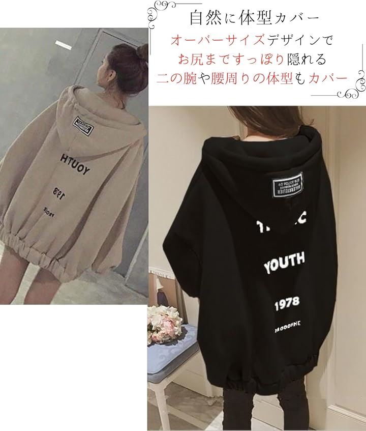 「特徴(2):大きめサイズとジップアップ仕様」全体的に大きいサイズで設計されており、体型カバーにも効果的なロングパーカー。