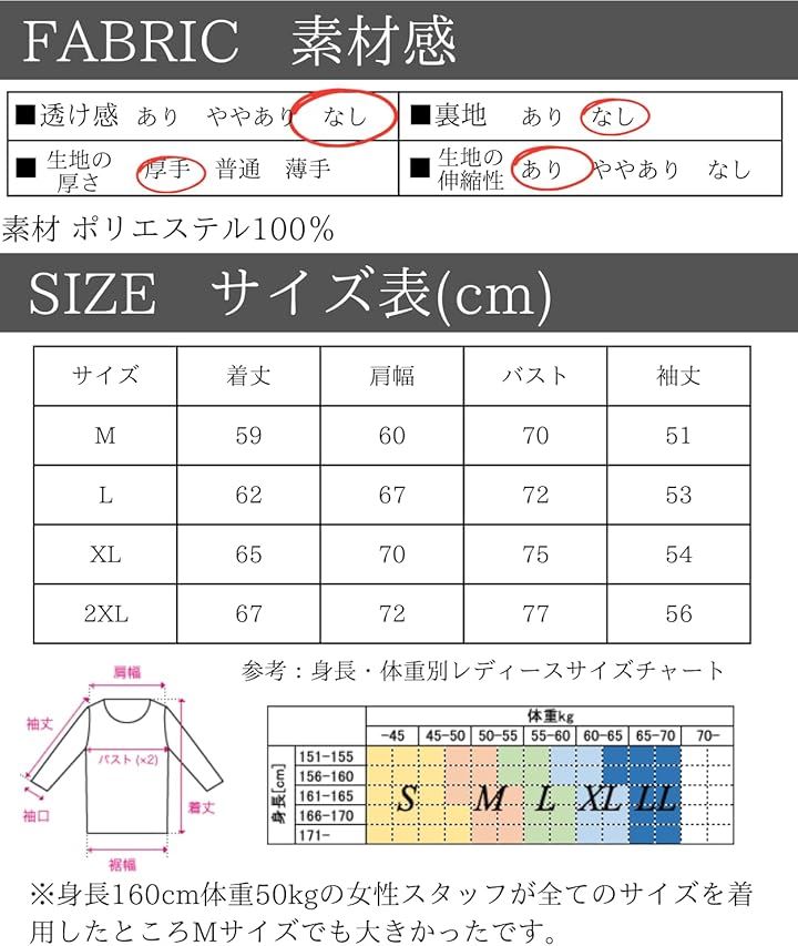 「素材」ポリエステル100%「カラー」クリーム、ブラック、グレー「サイズ(cm)」M 着丈59/肩幅60/バスト70/袖丈51 L 着丈62/肩幅67/バスト72/袖丈53 XL 着丈65/肩幅70/バスト75/袖丈54 2XL 着丈67/肩幅72/バスト77/袖丈56