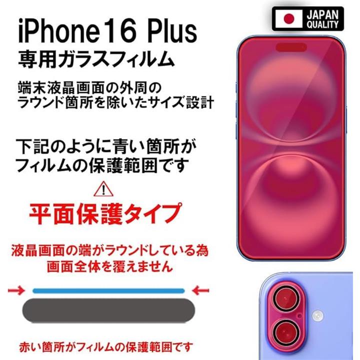 RISE 2枚+2枚 フィルム iPhone 16 Plus ガラスフィルム カメラフィルム レンズフィルム レンズ保護ガラス レンズカバー 保護フィルム 強化 高透過 高光沢 日本製 旭硝子 0.26mm 硬度10H 2.5Dラウンドエッジ 自動吸着 気泡ゼロ 飛散防止